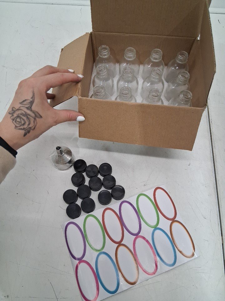 12PK Small Glass Bottles wITH Lid & 3 Stainless Steel Funnels for Potion, Juice, Wellness, Ginger Shots, Whiskey - 2OZ - CLEAR