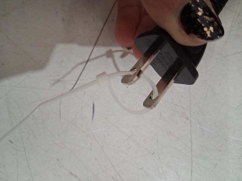 the bottom of the plastic container is cracked, looks to be an internal crack through the plastic, plug is zip tied