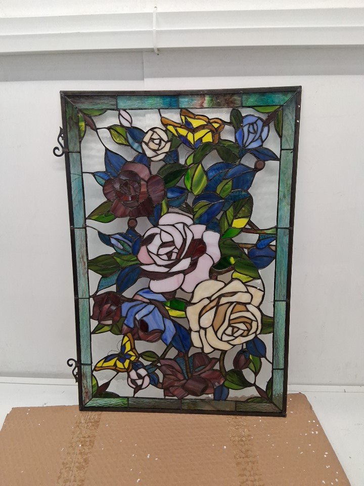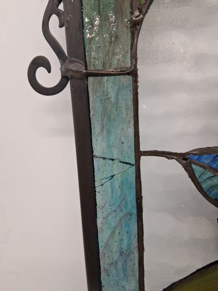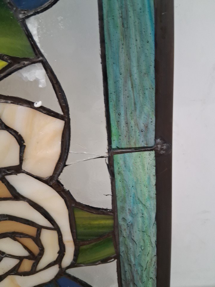 there are 2 small cracks in the glass one piece being slightly lose but not missing the other is only cracked also missing hanging chain (photos will show)