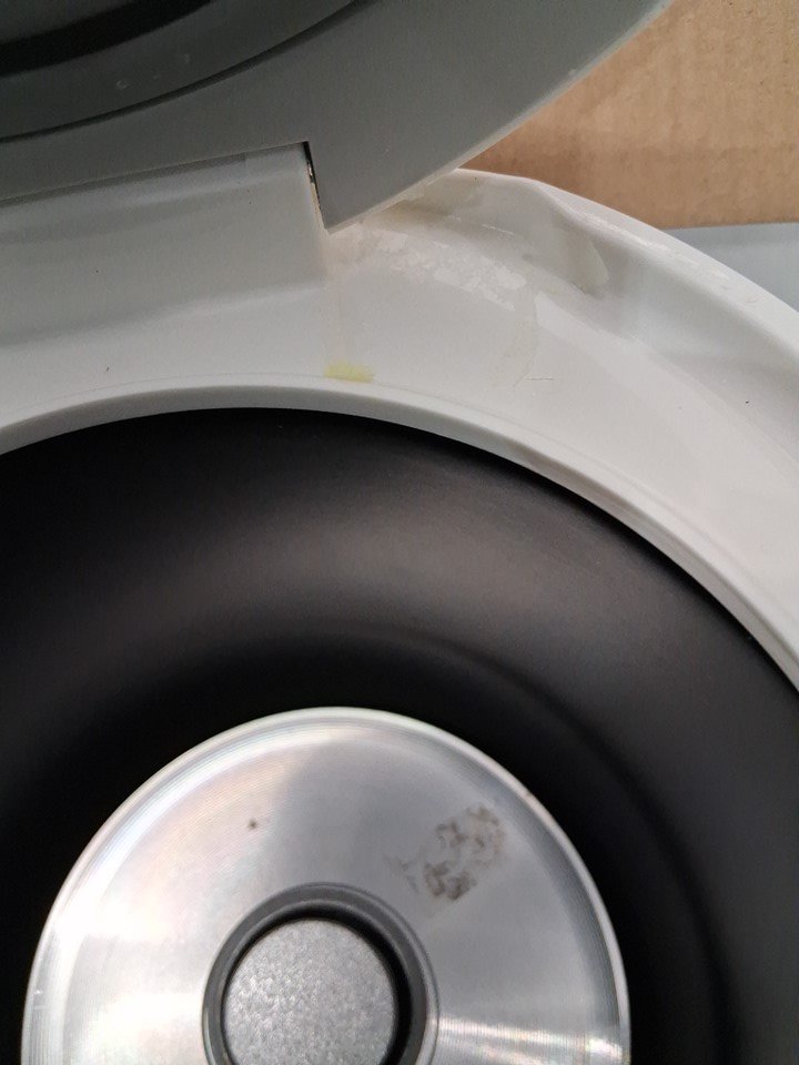 product has some yellow residue around where the hinge for the lid is tested for power (see photos)