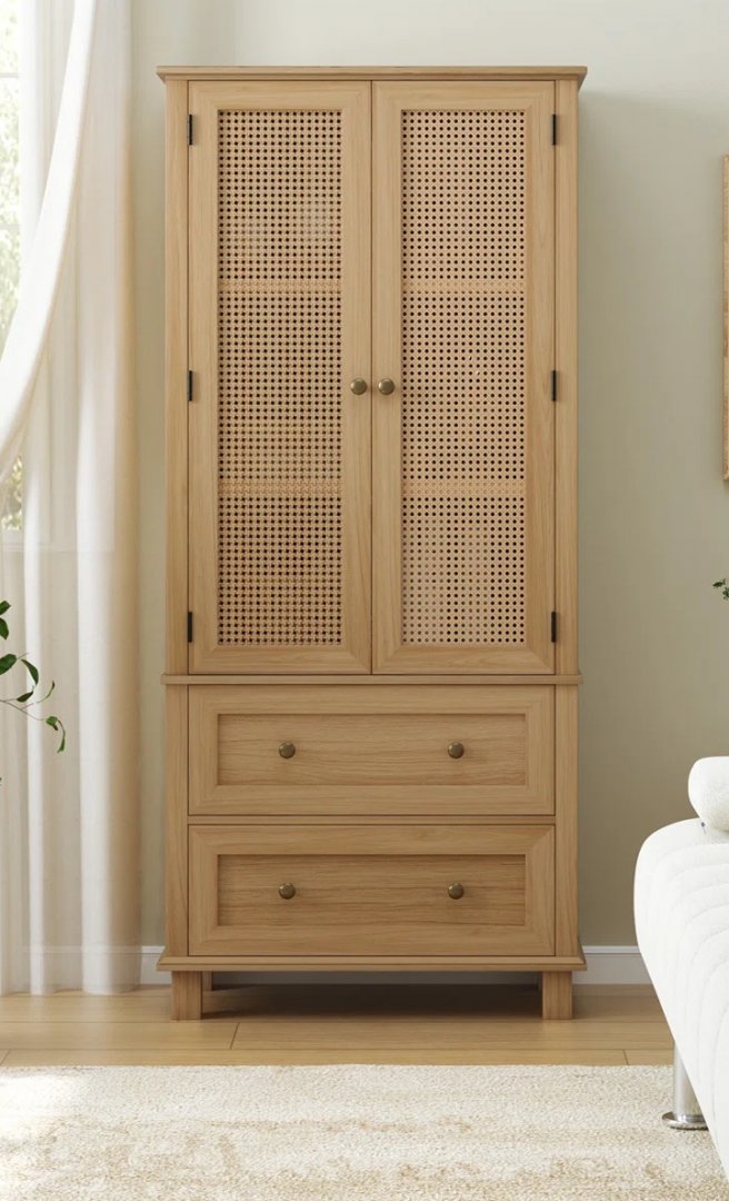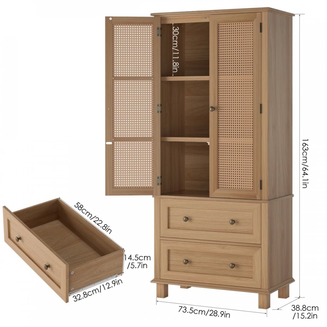 Faux Rattan Wooden Accent Cabinet and 2 Drawers - 64.1'' X 28.9'' X 15'' - Natural Brown