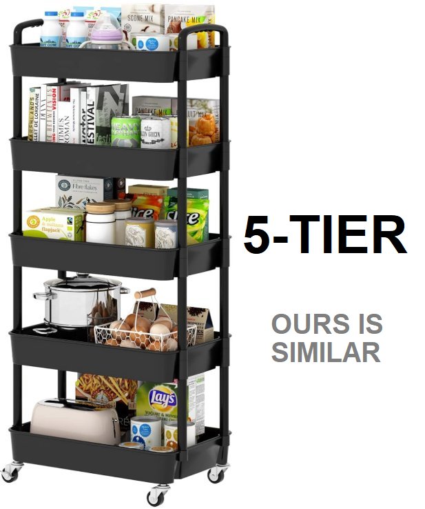 5-Tier Plastic Rolling Utility Cart with Handle - 15" X 11" X 55" - BLACK