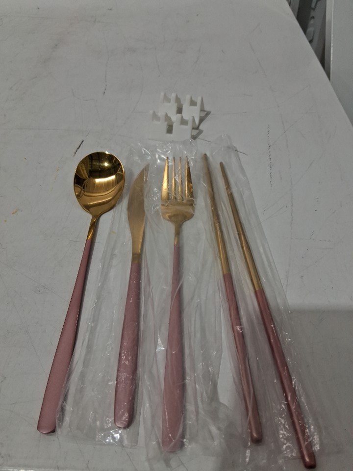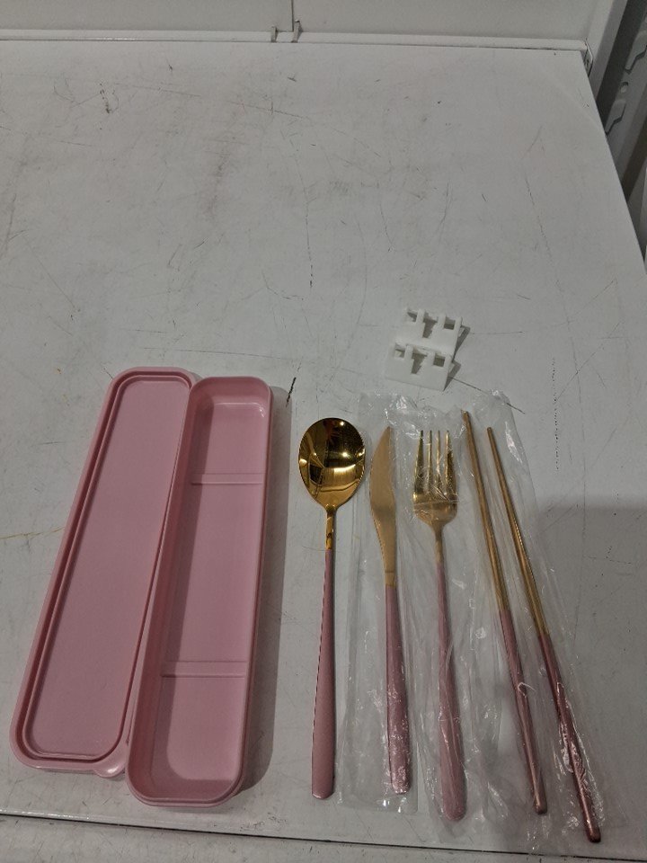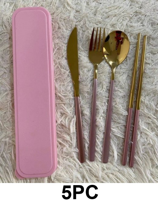 5pc Stainless Steel Portable Flatware Set - spoon, fork, knife, chopsticks - pink/gold