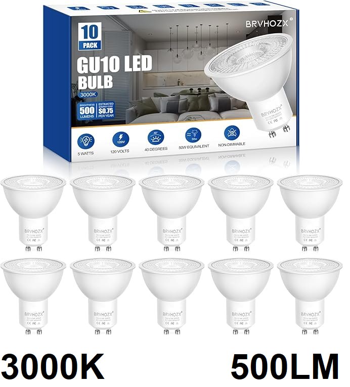 10pk brvhozx gu10 non dimmable led light bulbs - 500lm - 3000k - 120v - 5w - white (model: gu10-w)
