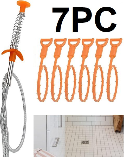 7pc AMAZONBASICS DRAIN CLOG REMOVING TOOL WITH 6 PLASTIC SNAKES - orange
