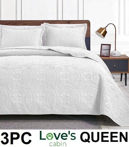 3PC LOVES CABIN soft microfiber QUILT COVERLET Set - QUEEN - WHITE