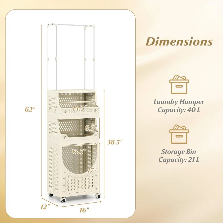 giantex 4-tier laundry cart with hanging rack & lockable wheels - rolling hamper for kitchens, laundry rooms - 62" h - Beige (Model: JV13183BE)