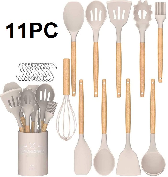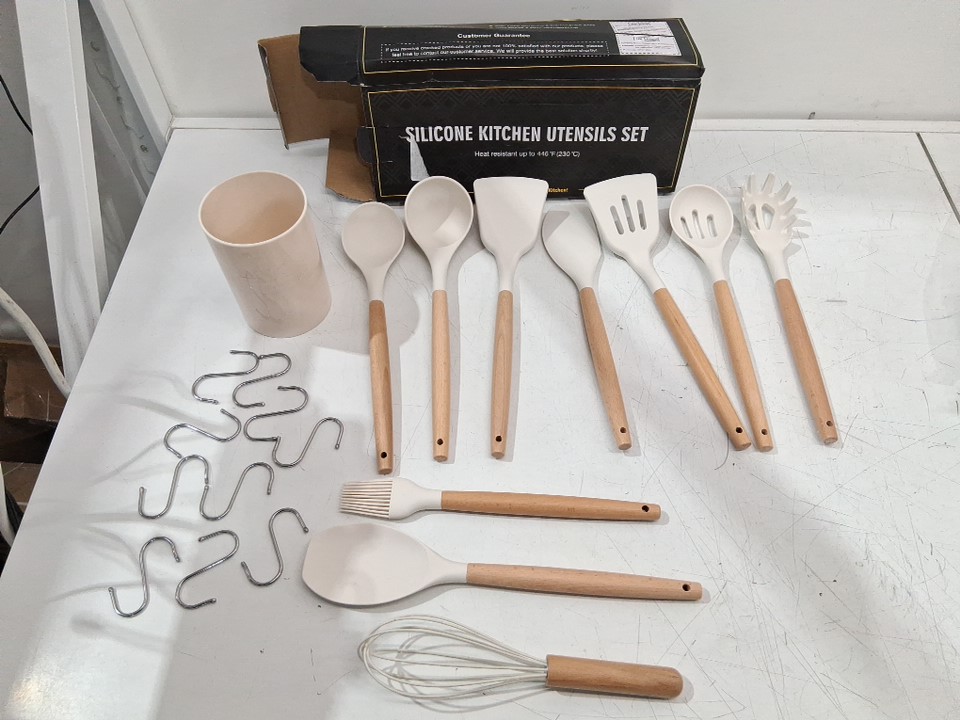 item is missing all the measuring cups, spoons and tongs from the set and has some scuffs and dust on the pieces