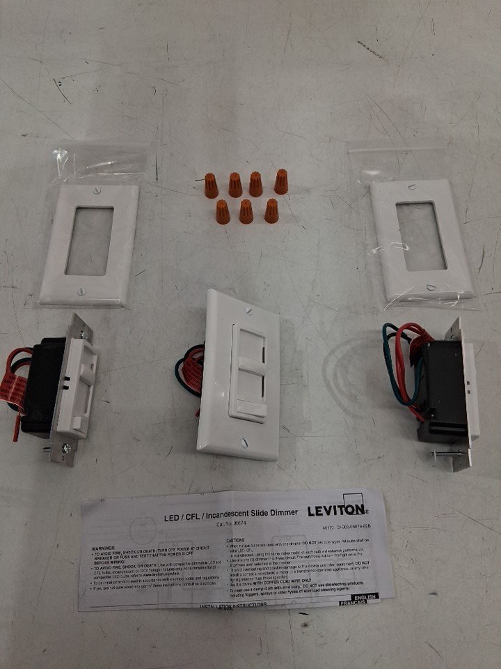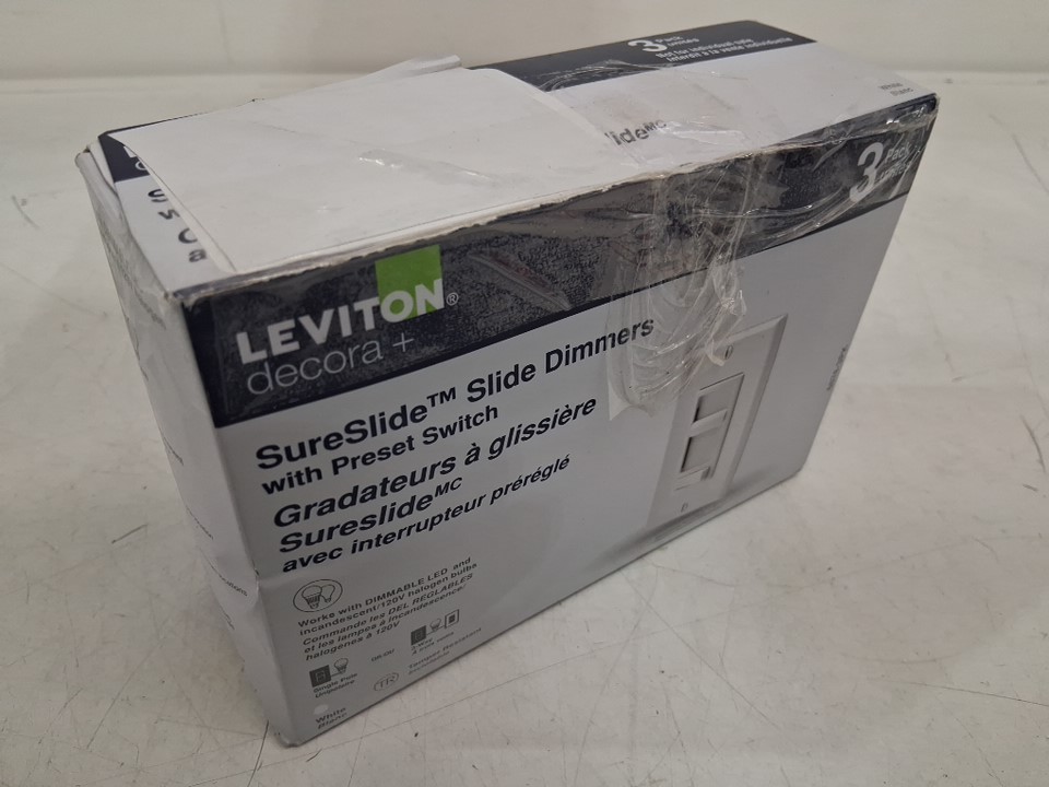 3PK Leviton Decora Sureslide Universal LED Dimmer Switch - 600w-120vac Incandescent, 150w-120vac Dimmable LED and CFL, 60hz, Single Pole and 3-Way - White (MODEL: 06674)