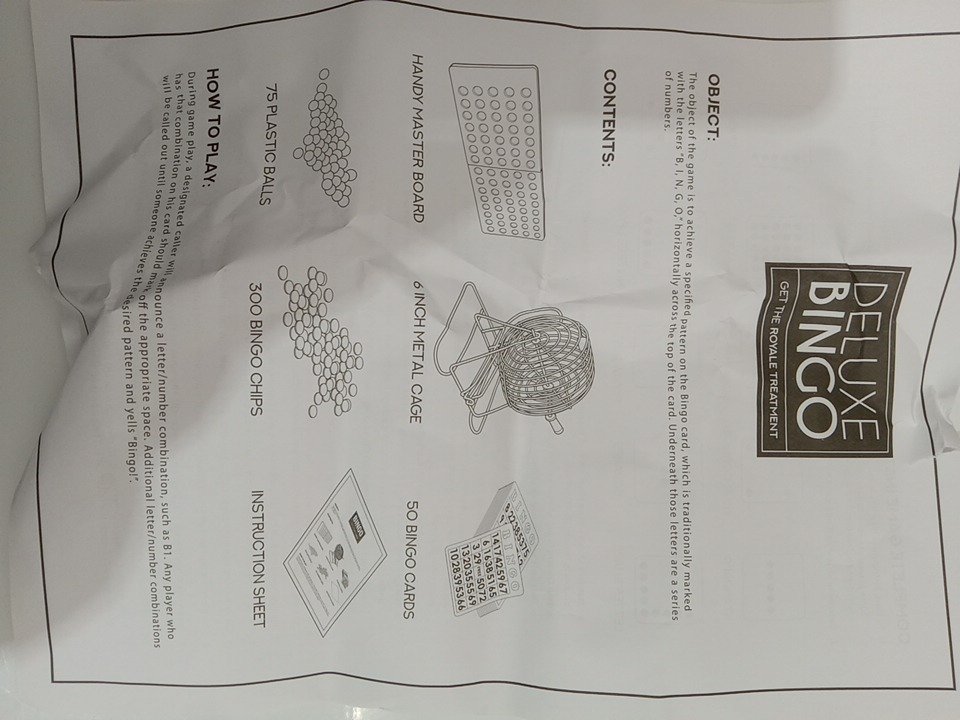 The item is missing 50 bingo cards and 300 bingo chips.