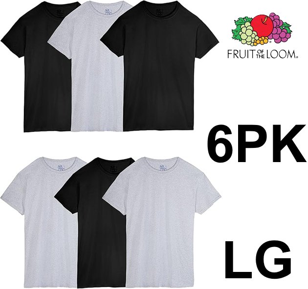 6pk men's fruit of the loom stay tucked crew t-shirt - large - black/grey (model: 405401-13)