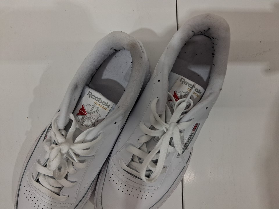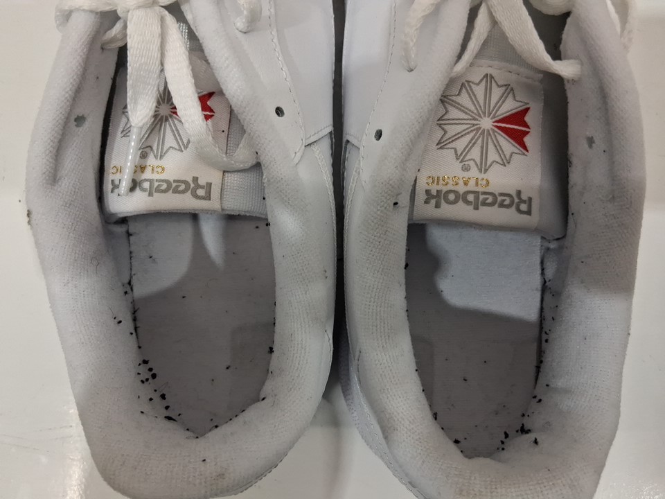 Please See Photos: - There is some debris on the soles and on the inside of the shoes consistent with light previous use.