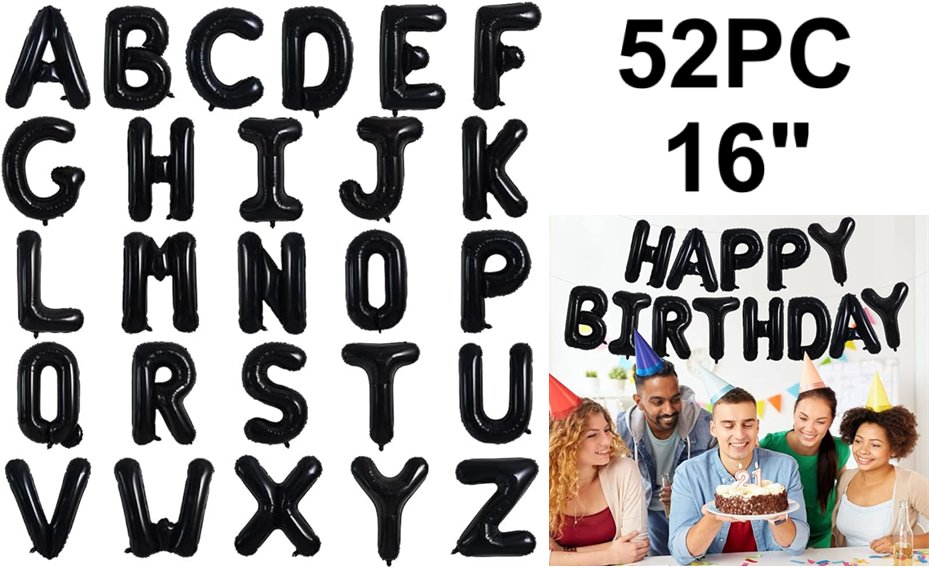 52PC TONIFUL PARTY FOIL LETTER ALPHABET A-Z BALLOONS - 16" - BLACK