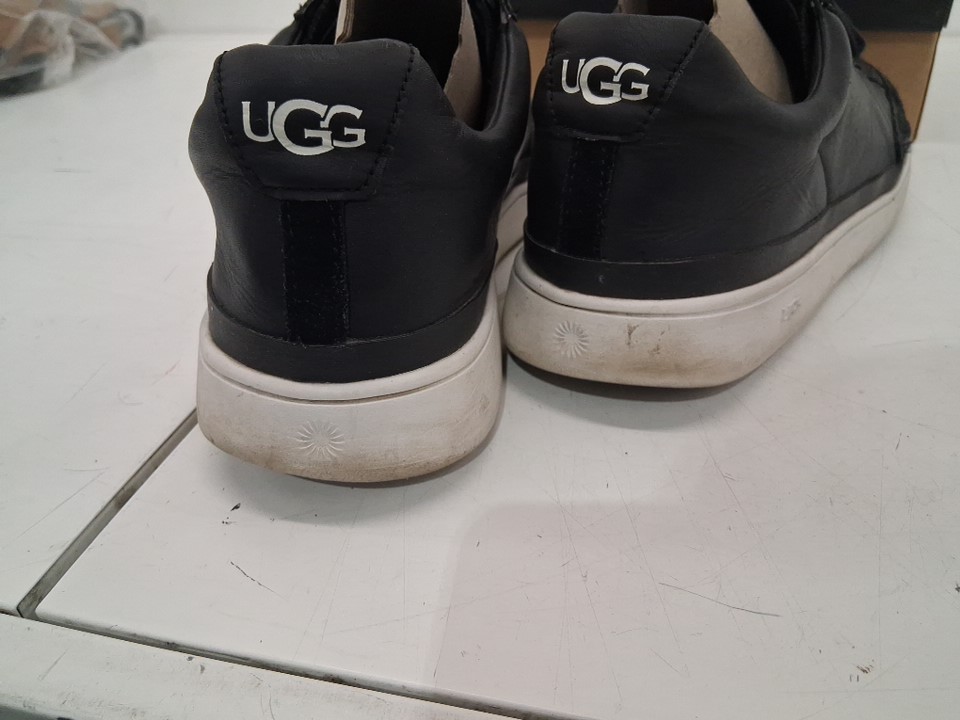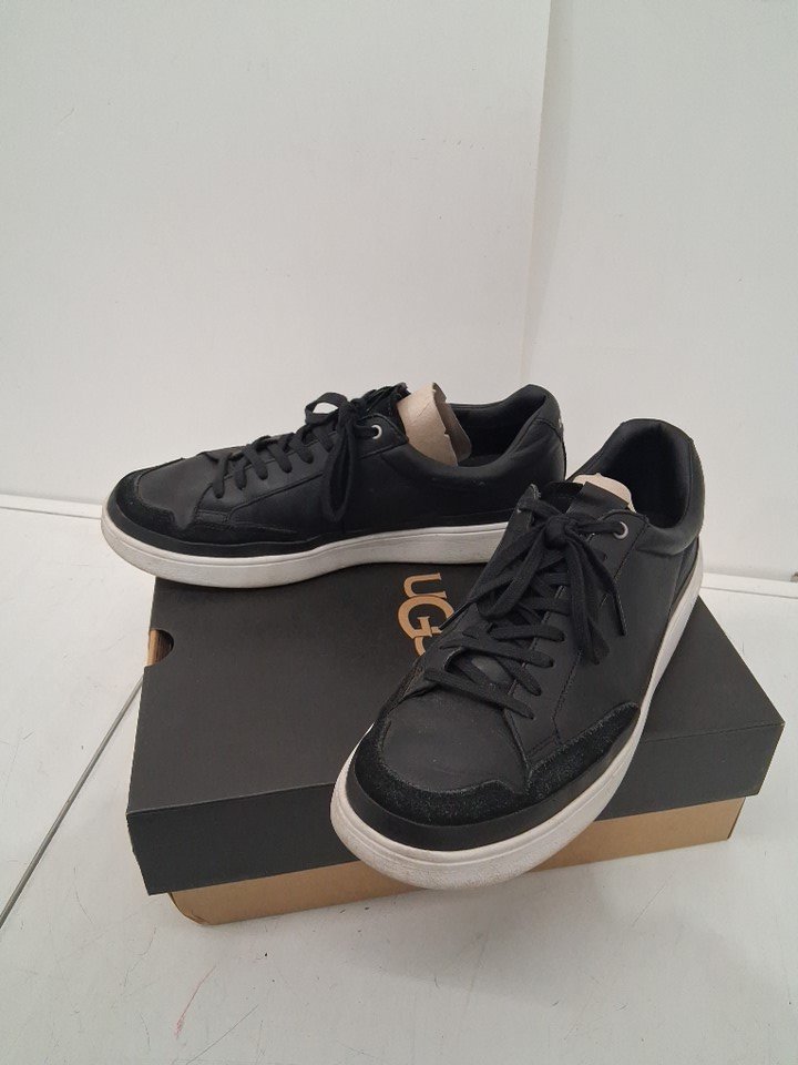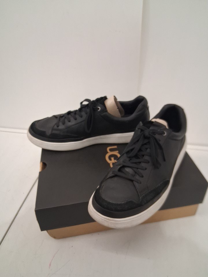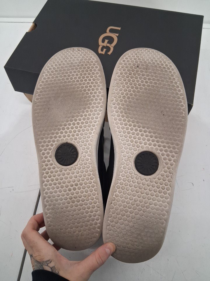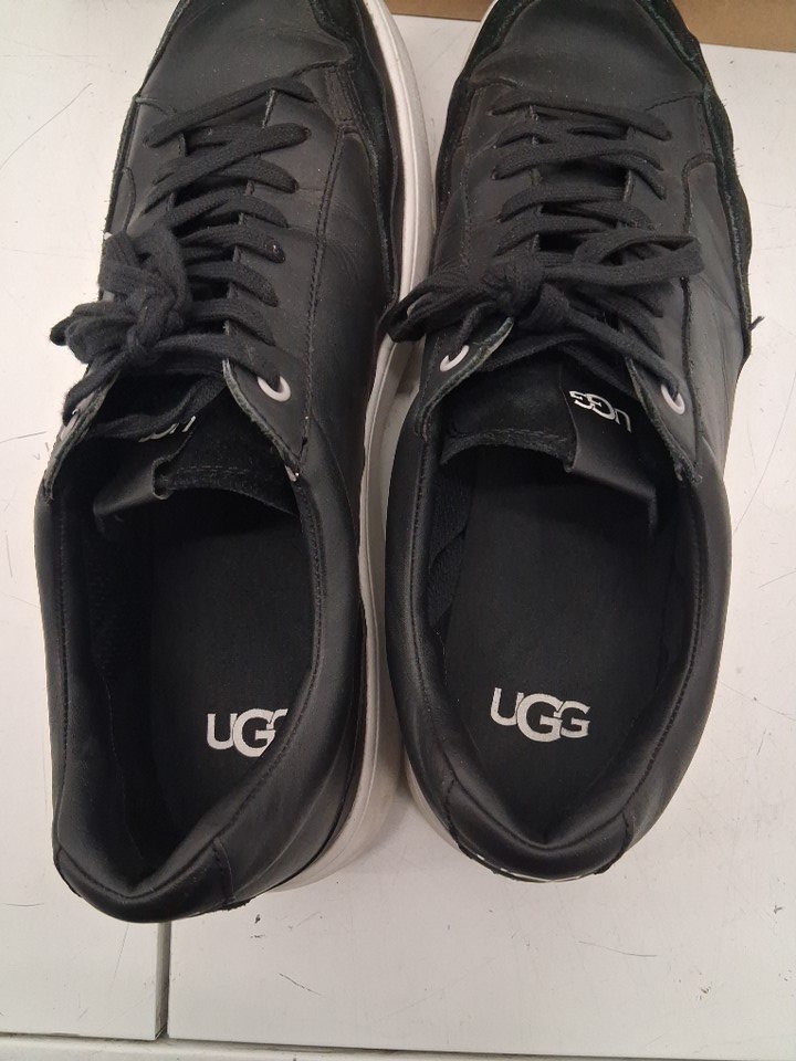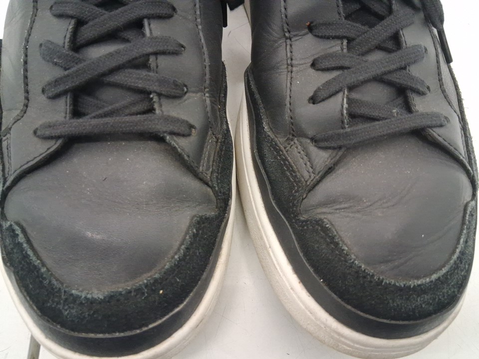 Sneakers have visible dirt on soles, and dirt on toes and sides of shoes.