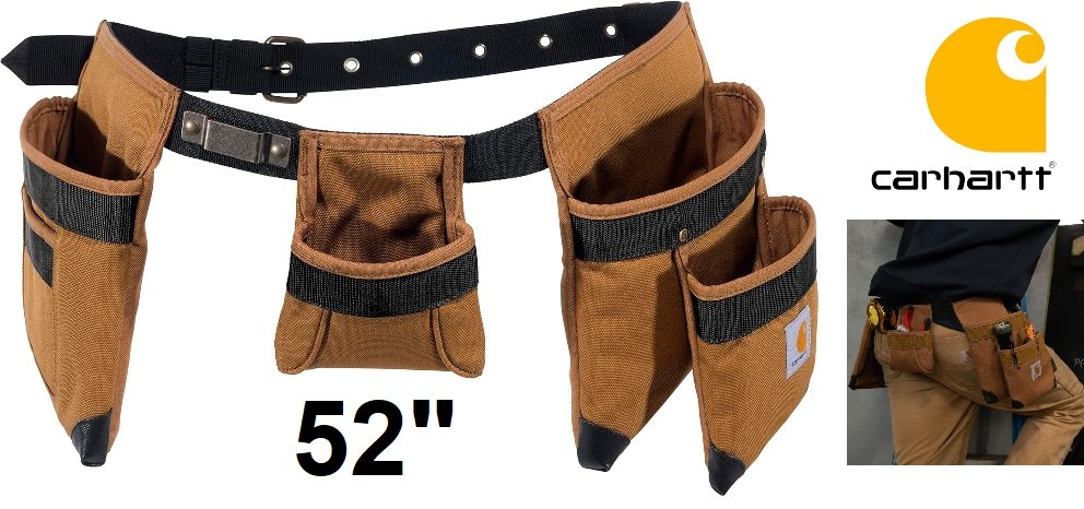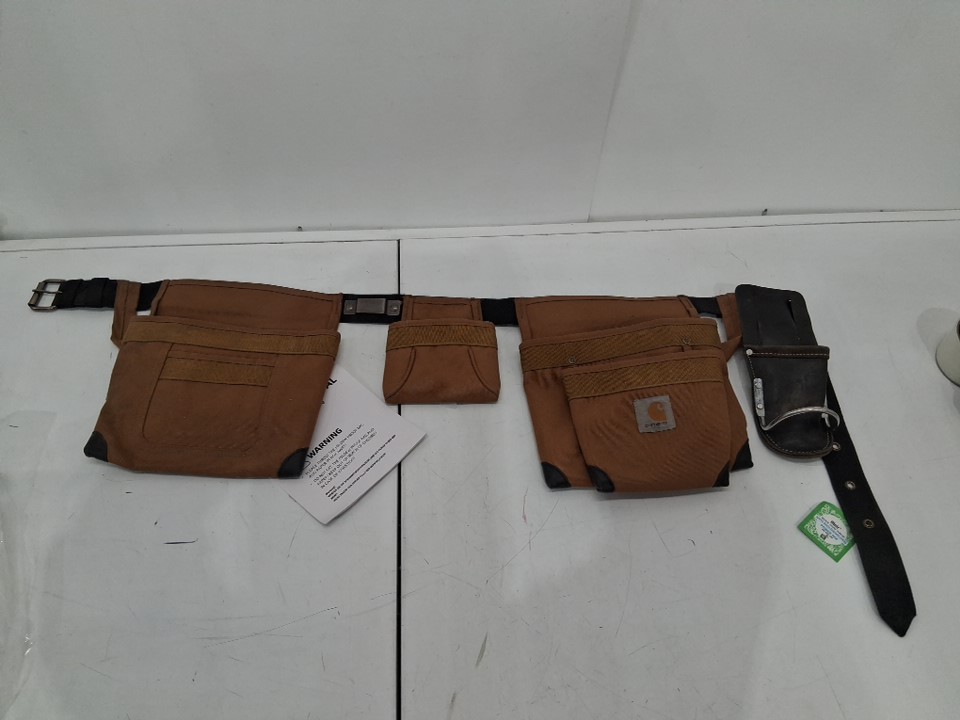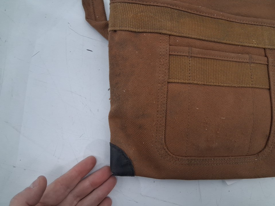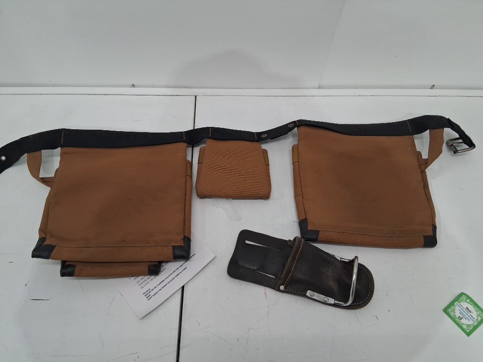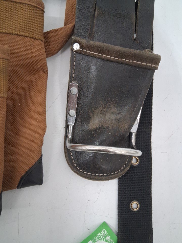 Belt has dirt stains on it from previous use, and belt has hammer holder attachment which has scuffing on it