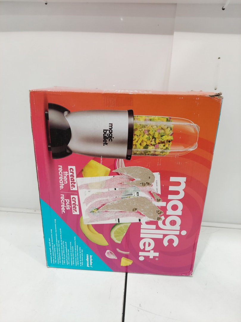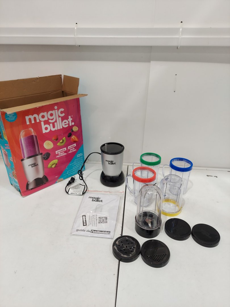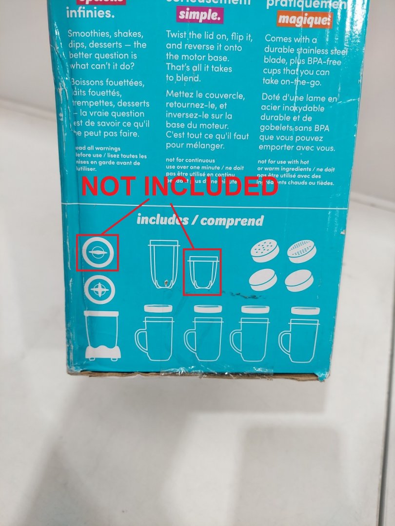 Item arrived lightly used and without the straight blase and small blender cup but these can be replaced and the item can function without these pieces. tested for power and function, see photos.
