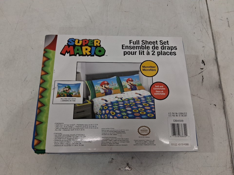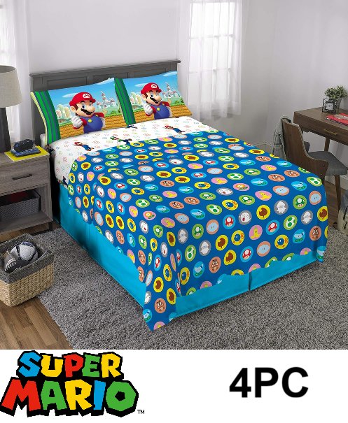 4pc Franco Kids Soft Microfiber Sheet Set with flat/fitted sheet and 2 pillow reversible pillowcases - Full - Super Mario