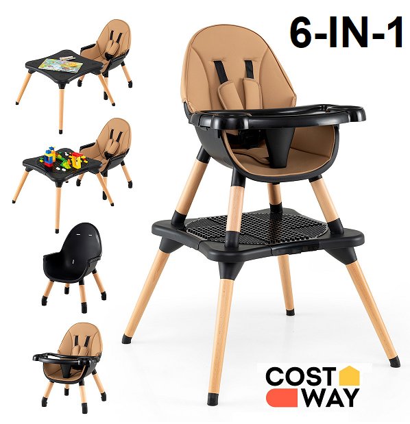 costway 6-in-1 baby convertible highchair with fabric seat - brown/black (model: be10071cf)