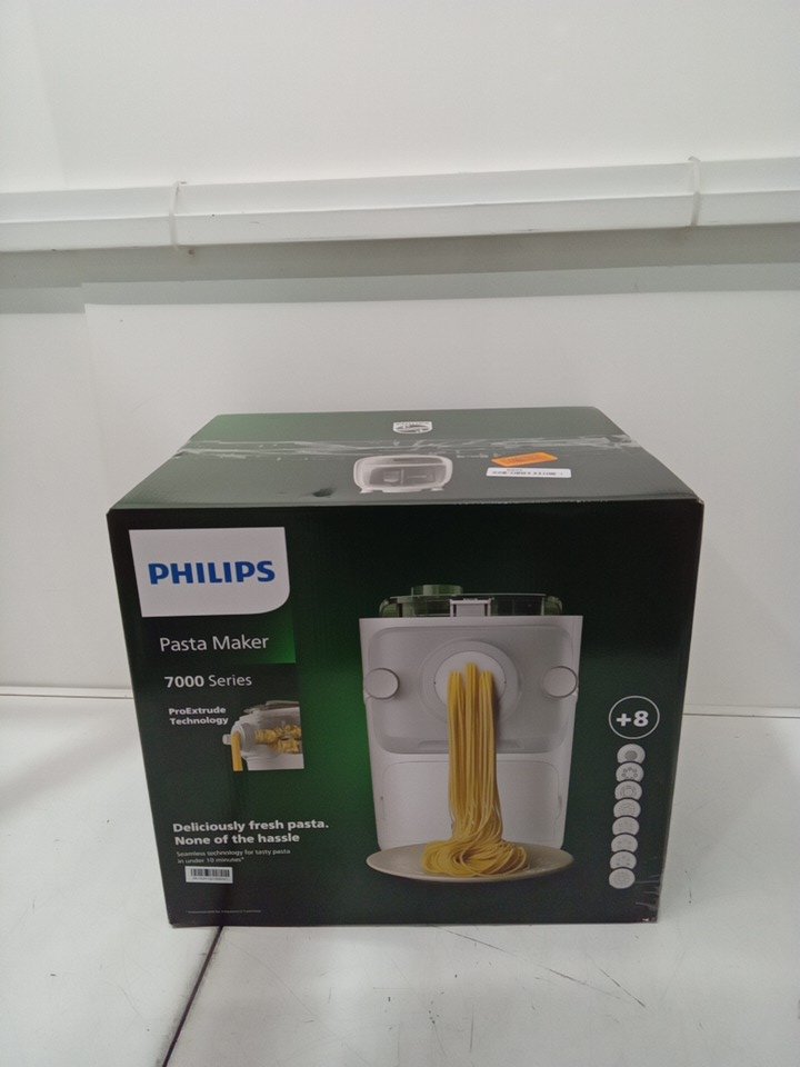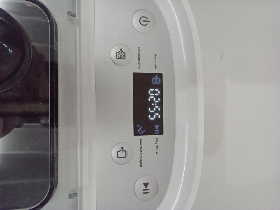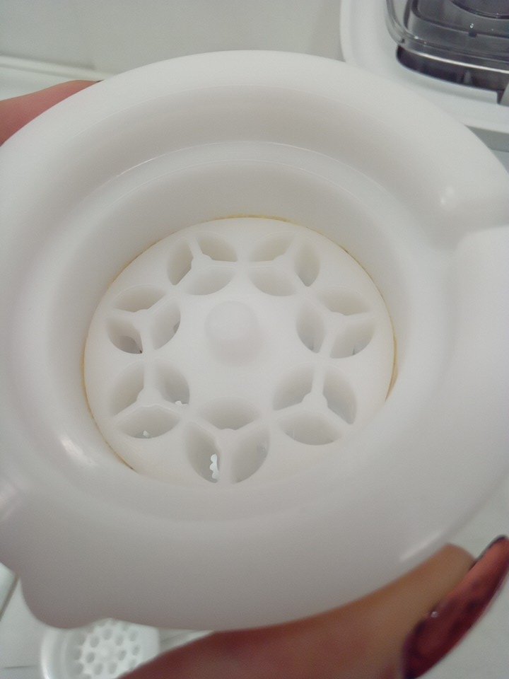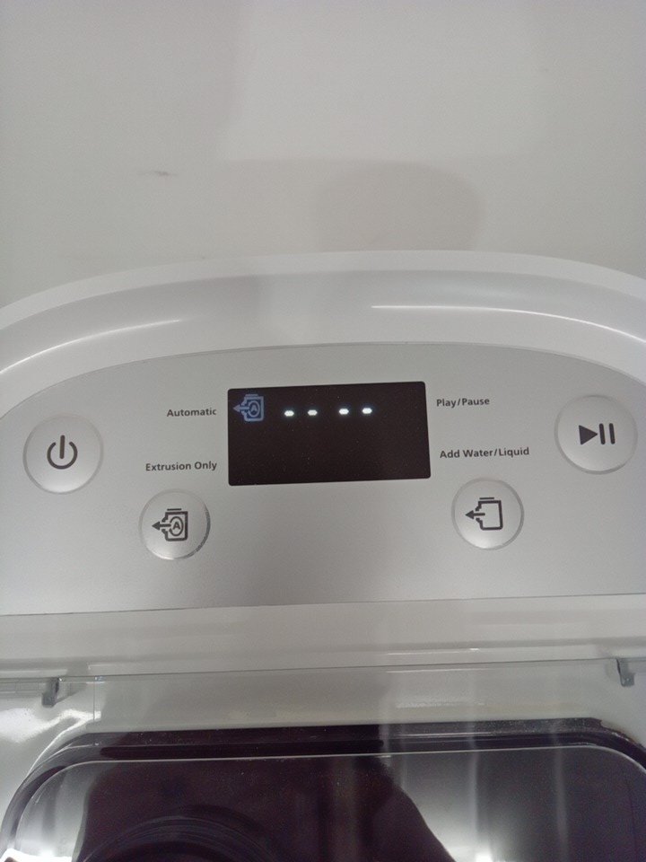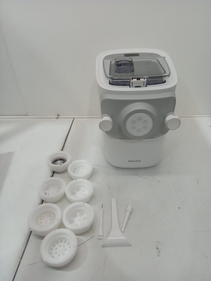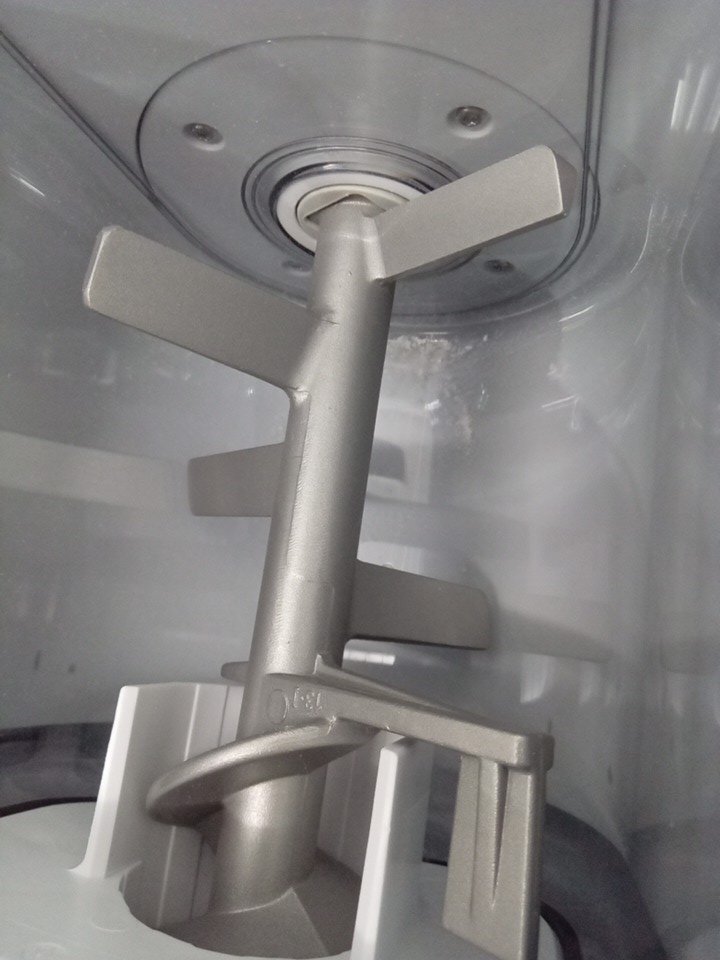 some flour residue inside churning chamber. some dried pasta can be seen inside one of the attachments.