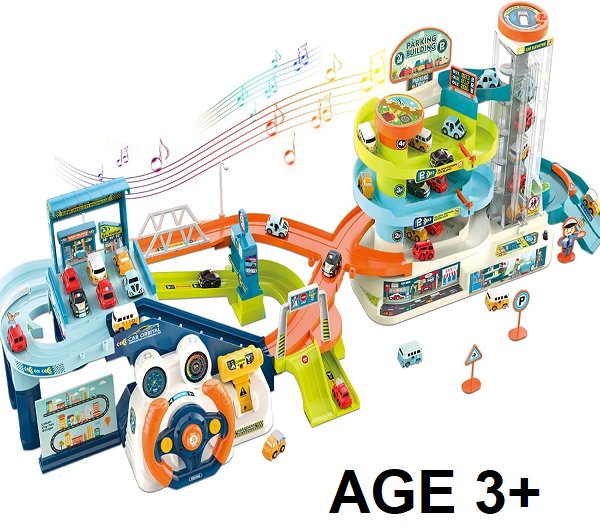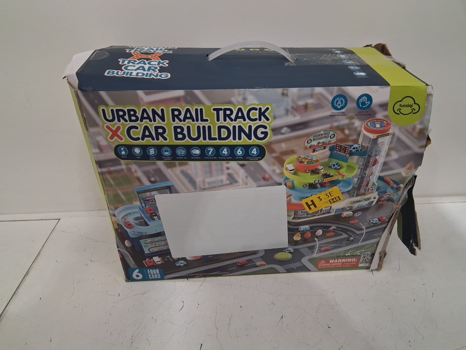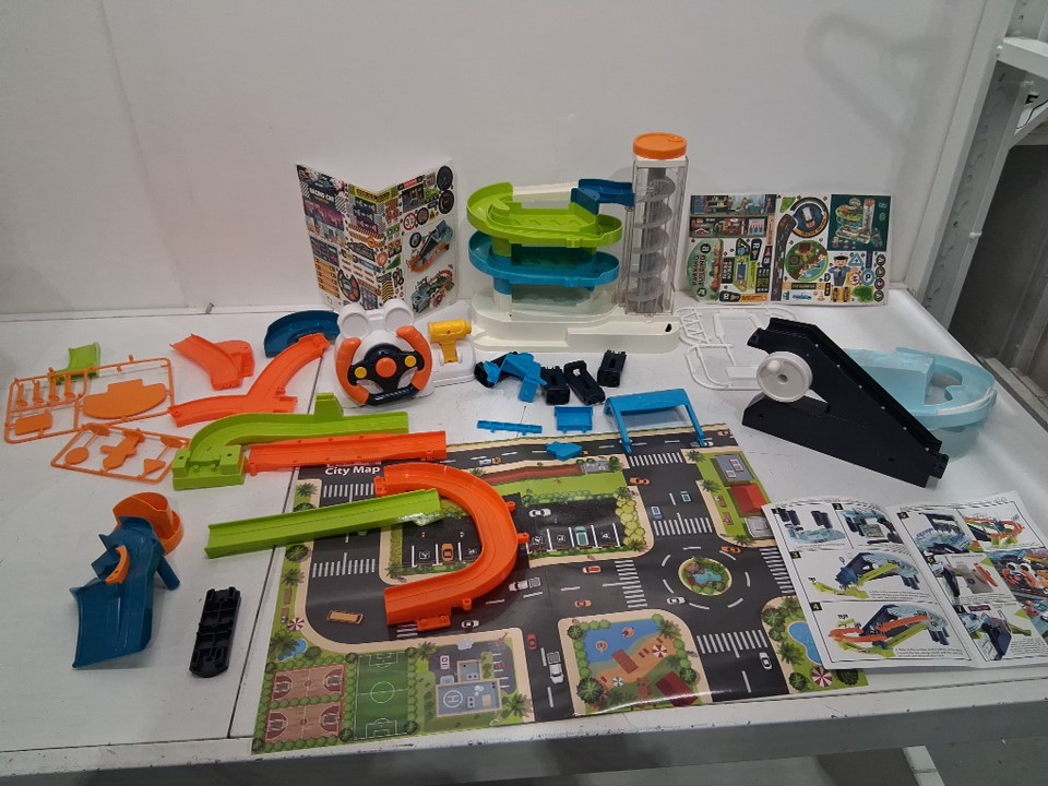 Item is missing all the vehicles, and one small blue rail(see photos) Lift portion is partially assembled. Tested- working