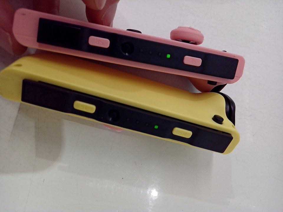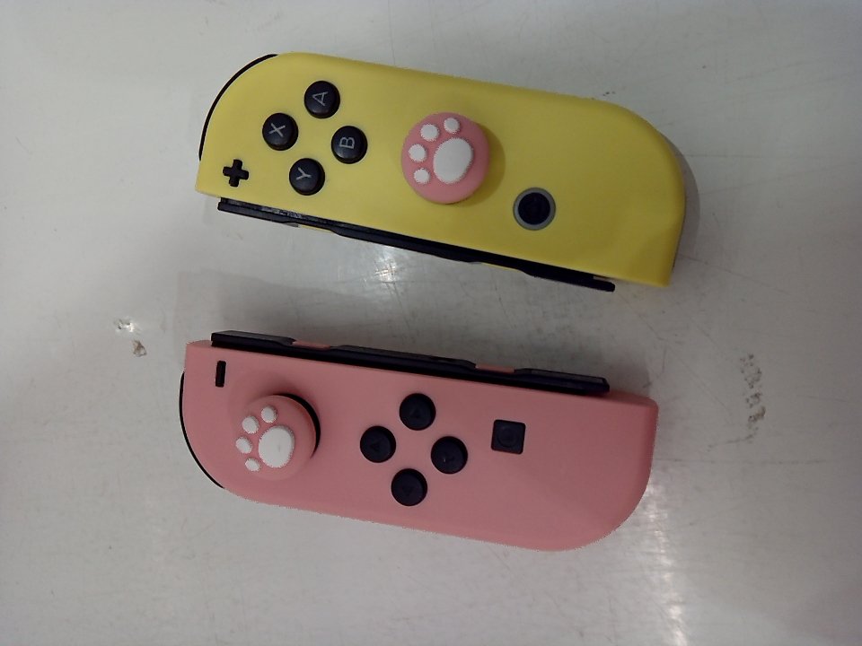 Ours include pink covers for the analog sticks with white paws on them. Please note that these are not official Nintendo branded joy-cons. Ours do not include any rails. Tested for power and inputs through Bluetooth connection to PC. (SEE PHOTOS)