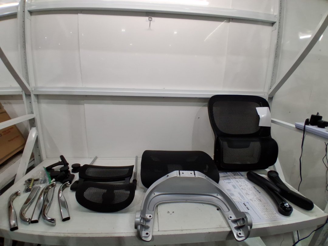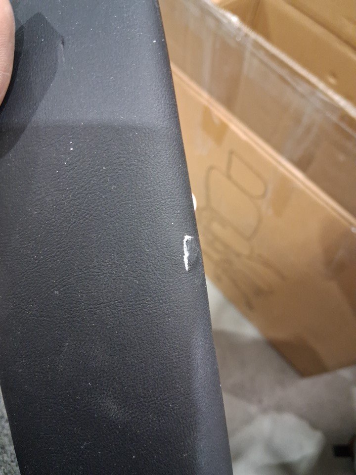 Item shows signs that it was previously assembled due to the screw inserts, and it has a small slit on the armrest. See photos.