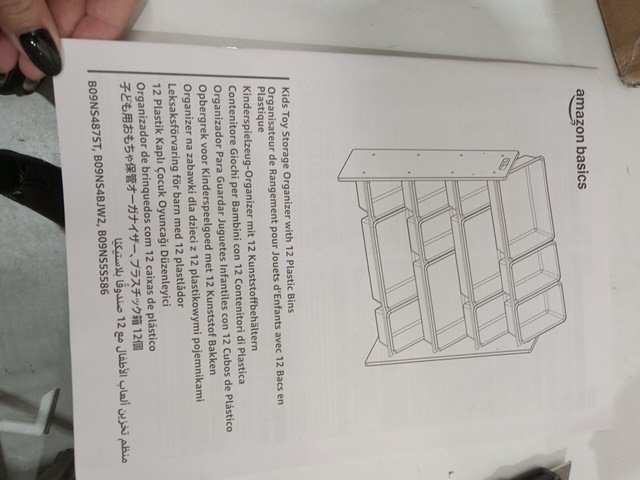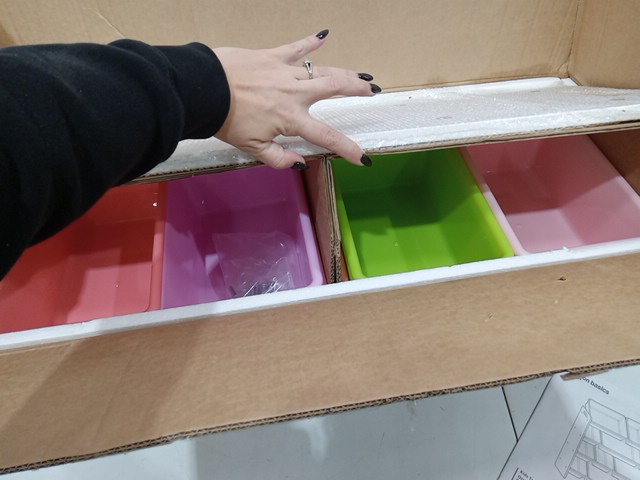 Amazon Basics toy storage organizer with 12 plastic bins for kids - 33.6" x 10.9" x 31.1" - white/pink/green/purple, (model: B09NS487ST)