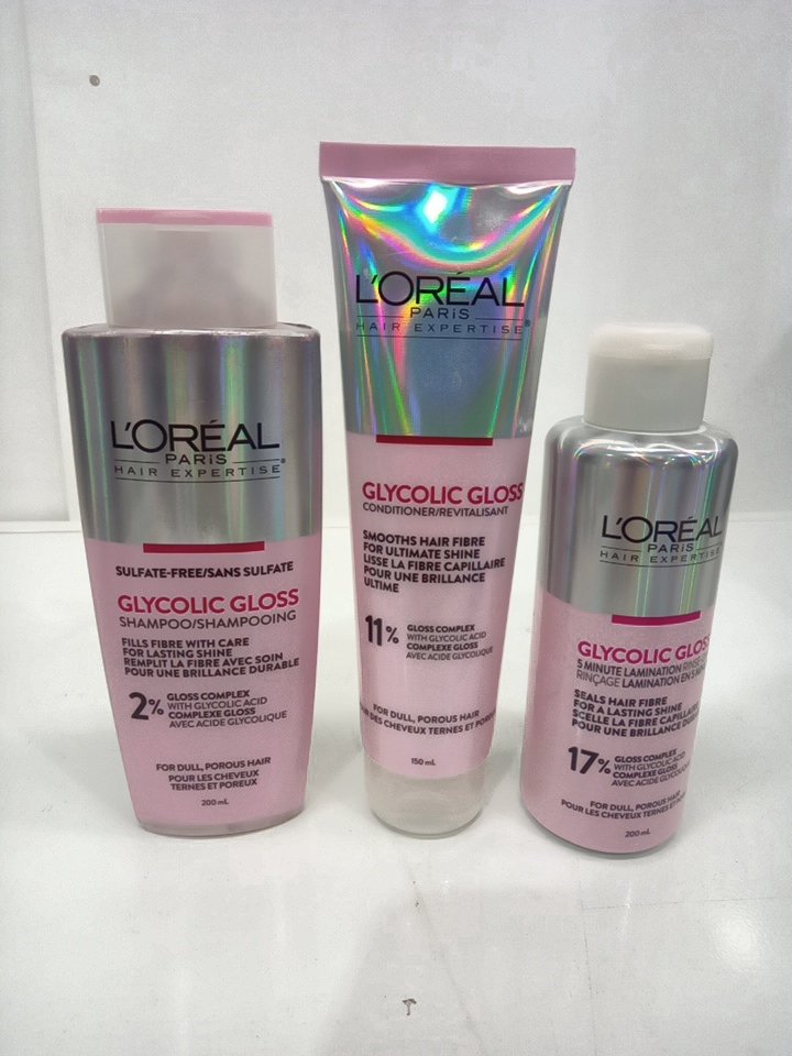 3pc L'Oréal Paris Hair Expertise Glycolic Gloss Shine Trio Set - lamination rinse-off, shampoo, and conditioner - 150ml, 200ml, 200ml