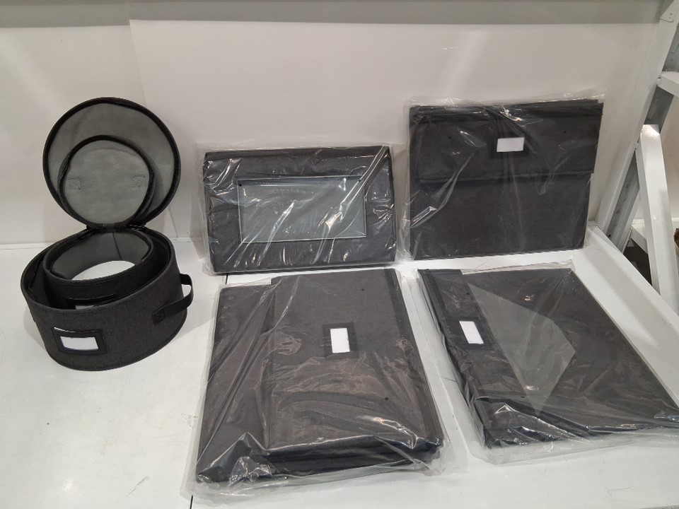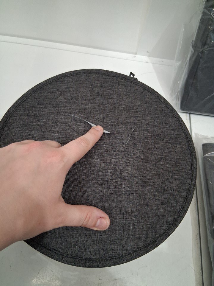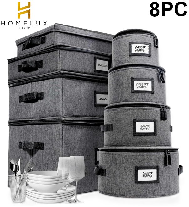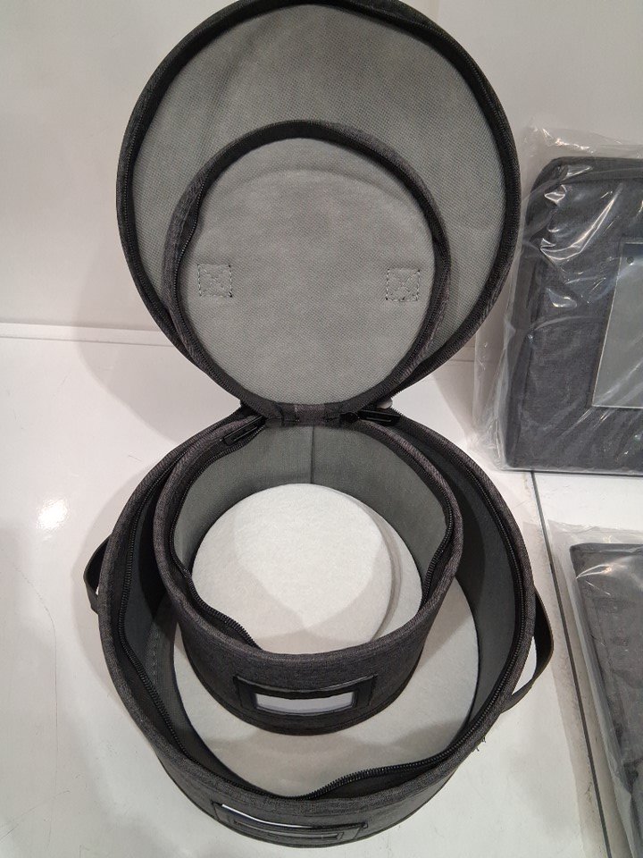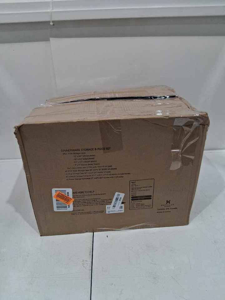 Item is missing two round plate storage cases: Salad plates (10" X 6.5") and Saucer Plates/Bowls (7" X 5") One of the containers has small cuts in tops of fabric.