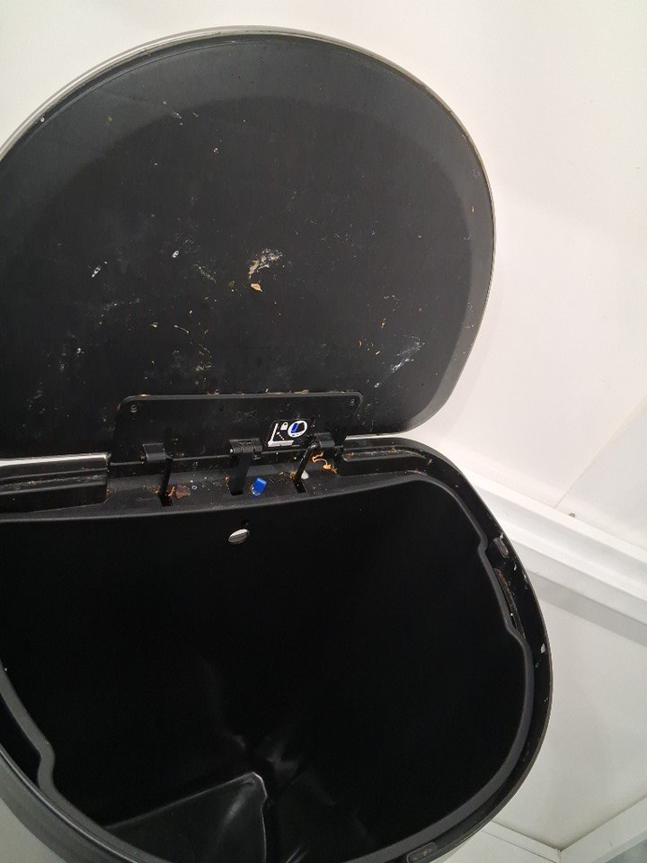 The step on the trash can is a bit difficult to open, and there is visible dirt both inside and outside from previous use. Refer to the photos.