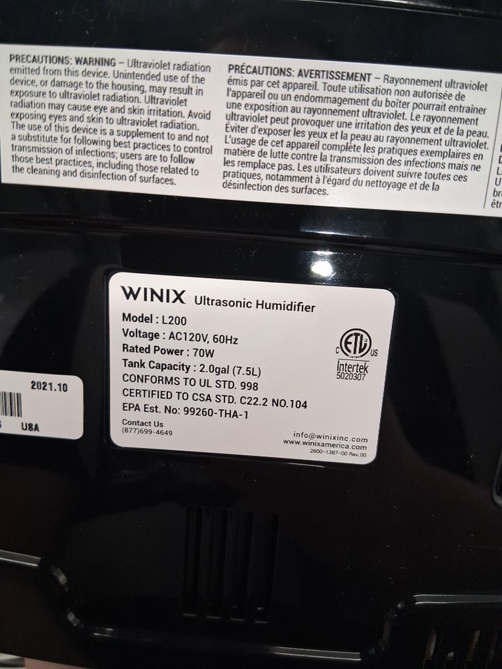 Winix L200 ultrasonic humidifier - 7.58L capacity - black (model: L200)