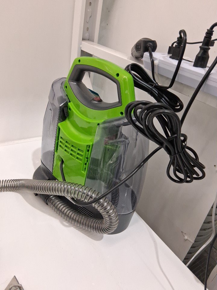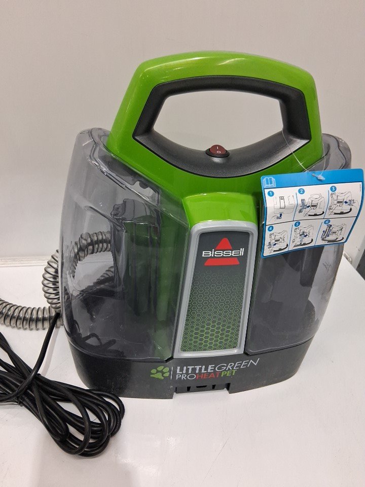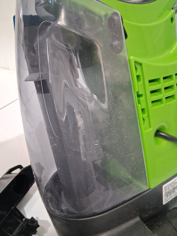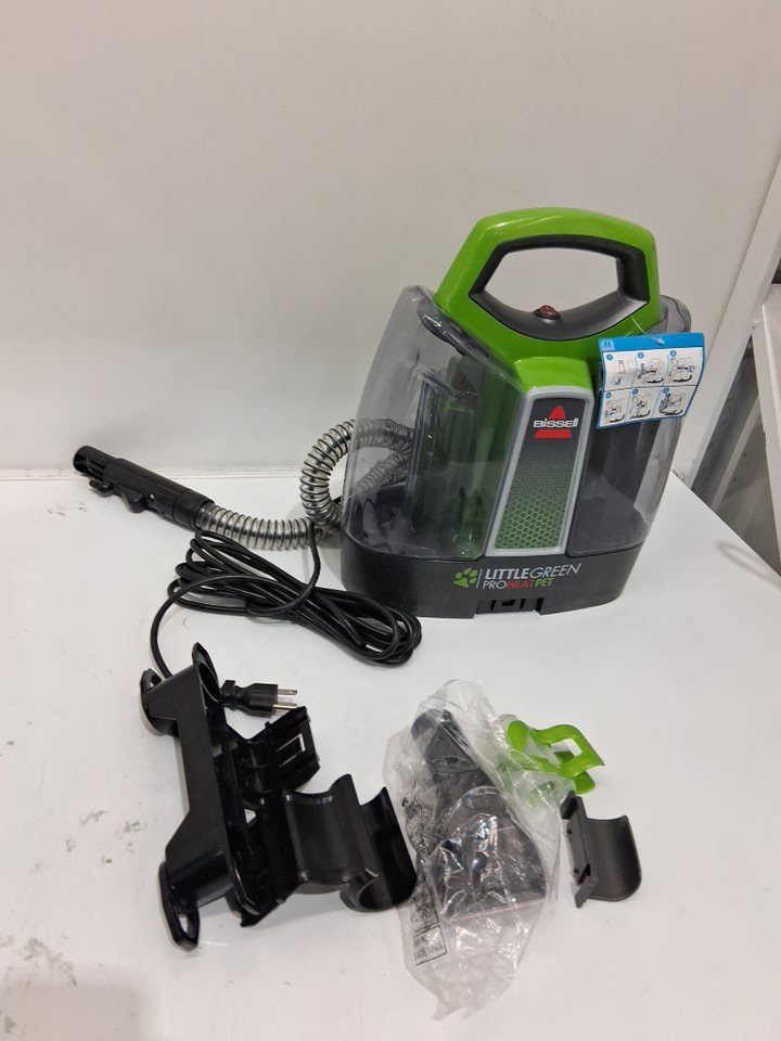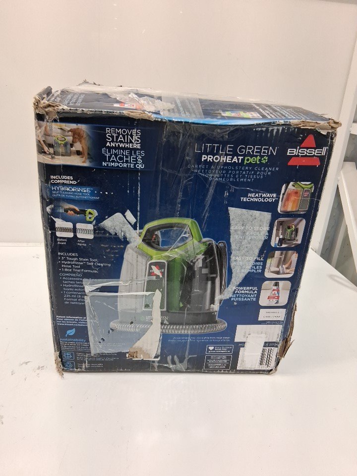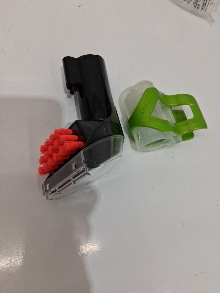 The liquid solution is missing from the original packaging. There are water stains on the water tank, there are dirt residue on the tool brush and bin from previous use. Tested for power and motor function only. (Please see photos)