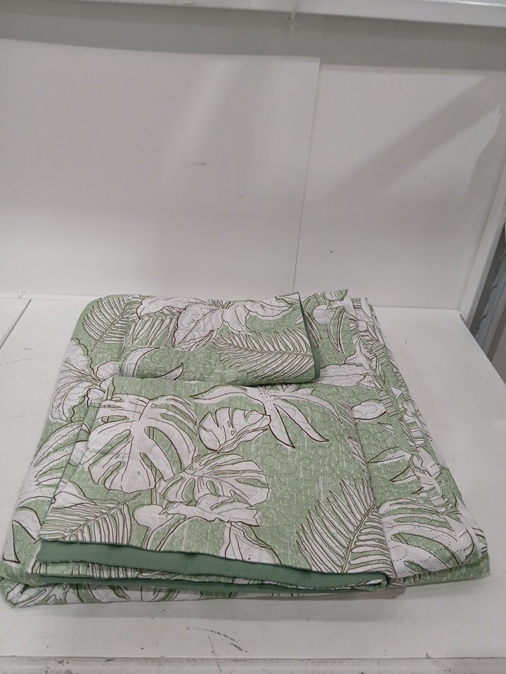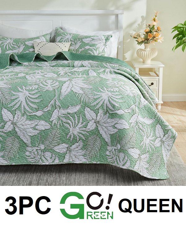 3pc Gogreen Lightweight polyester Quilt Coverlet with 2 Pillow Shams - queen - green floral