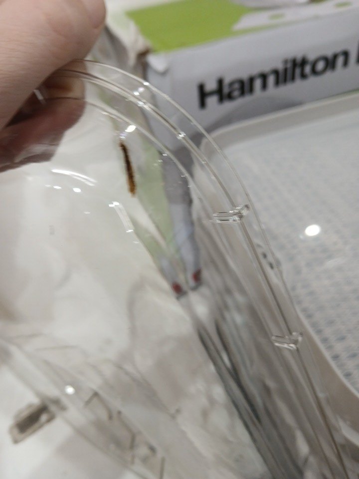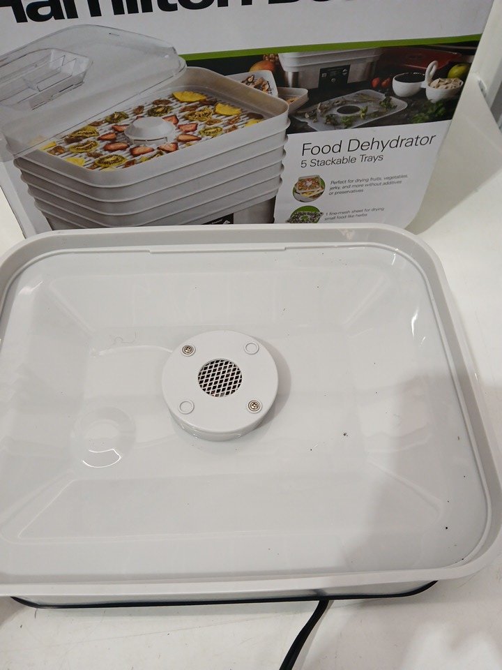 Has some debris inside and on the lid from use. Has a small dent in the front of the base. Tested for power.