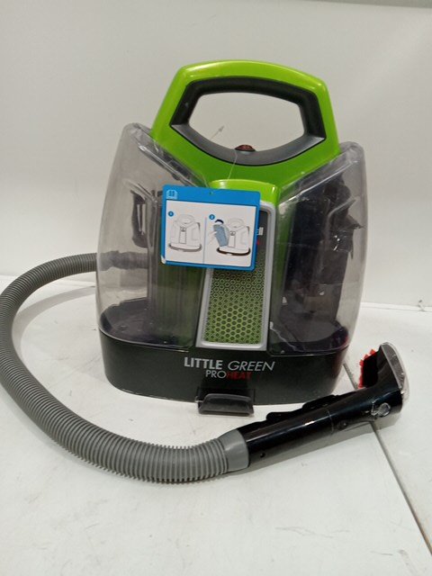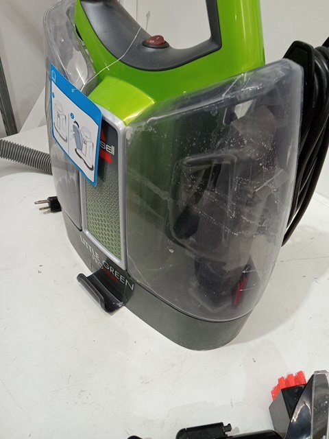 the plastic attachment piece is missing as well as the bottle of cleaning solution. there is so water in the holding tank as well as the bristles on the brush are bent and have hair and dirt in them. water reside on the entirety of the machine. tested for power.