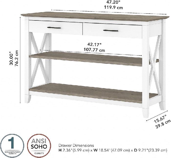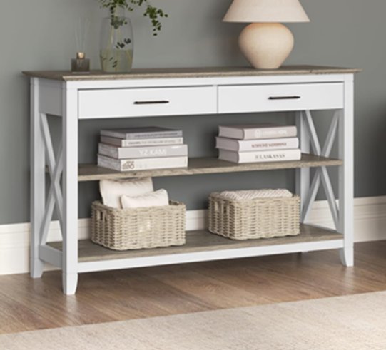 Bush Furniture Key West Console Table with Drawers and Shelves - 47" x 30" x 15.6" - White/Shiplap Grey (Model: KWT248G2W-03)