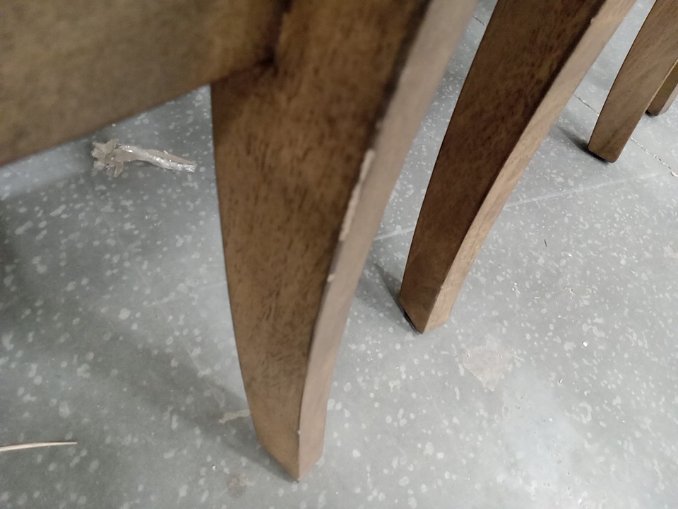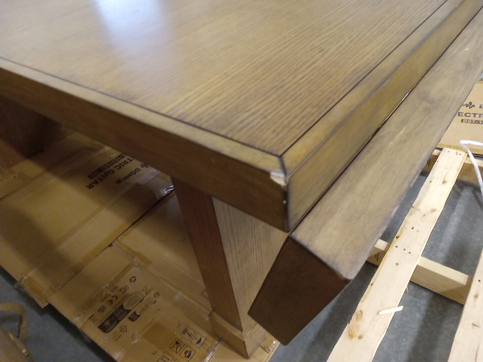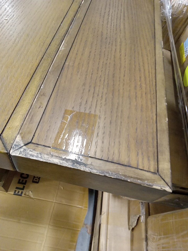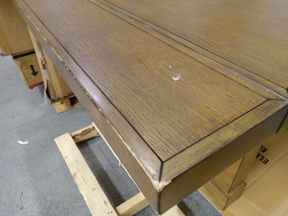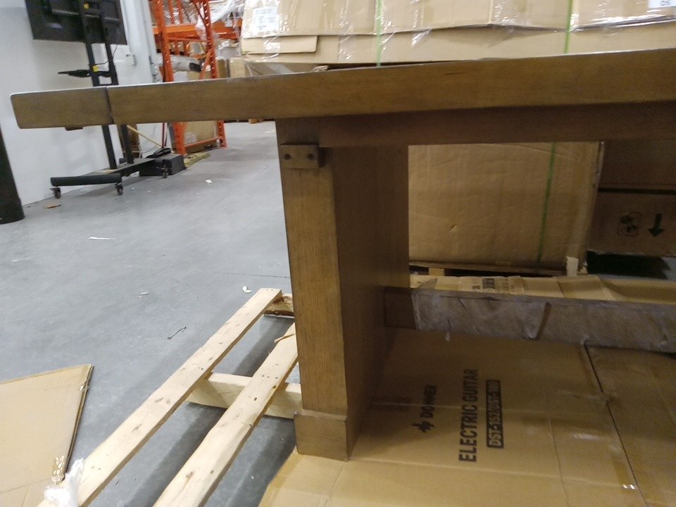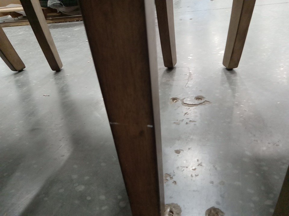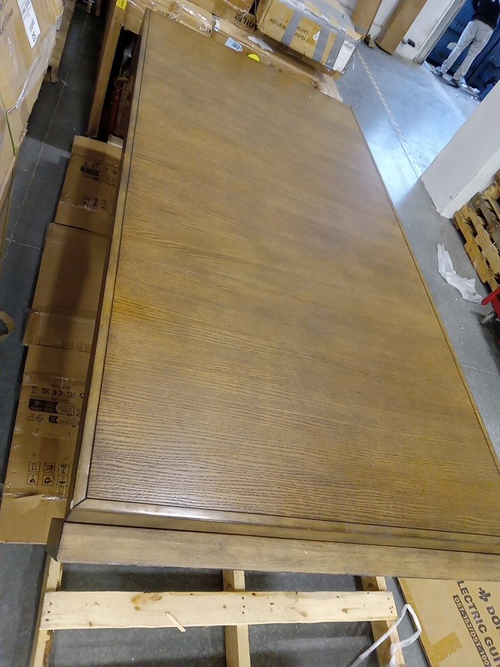 There are multiple scratches and chipping present on the edge of table and chairs from previous use and loose shipping. Lock of one adjustable levelers is broken. Please note this item is big and heavy, bring appropriate vehicle and help at the time of pick up. ~This item retails for 1499$~