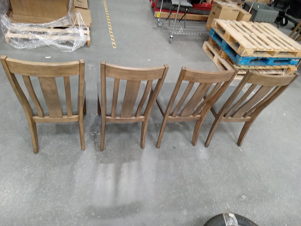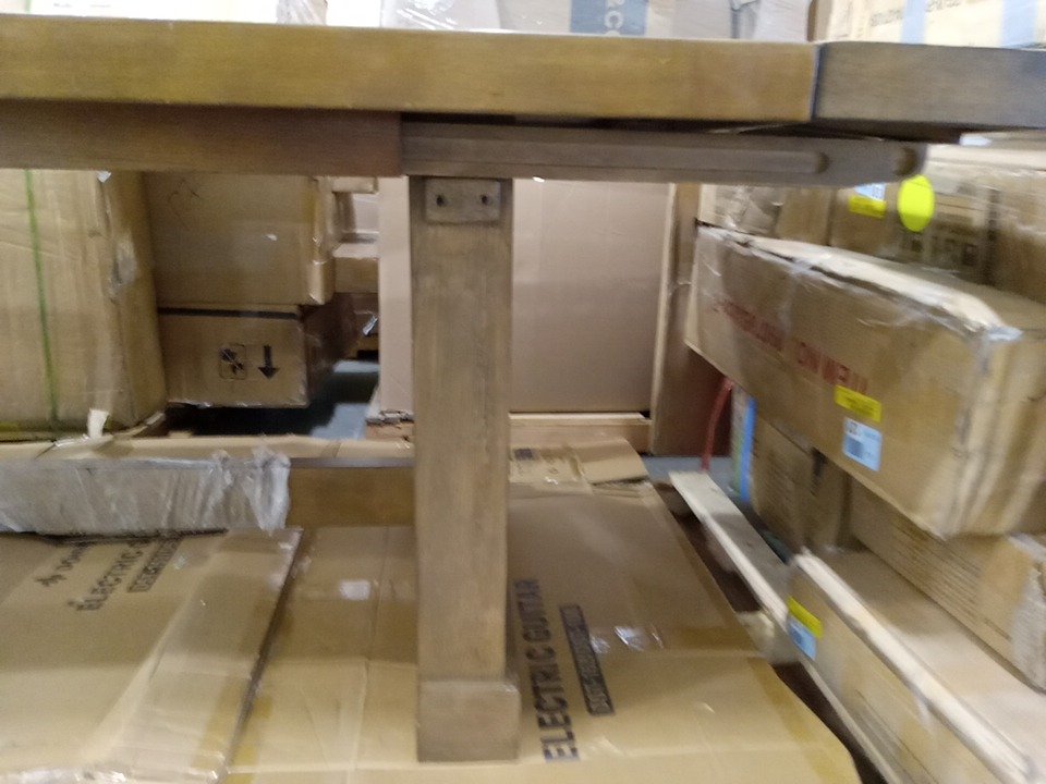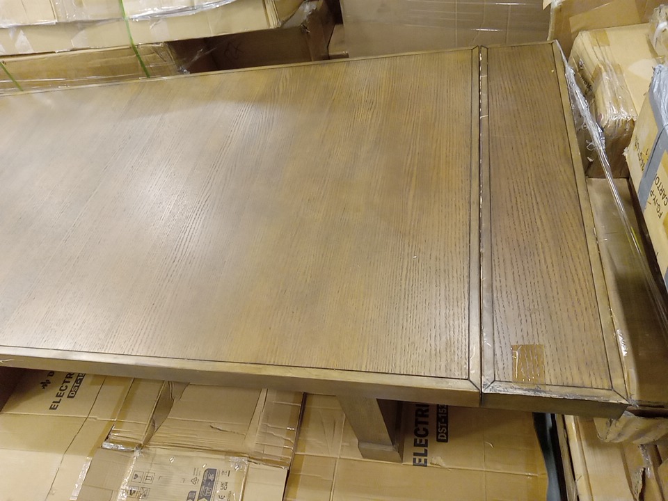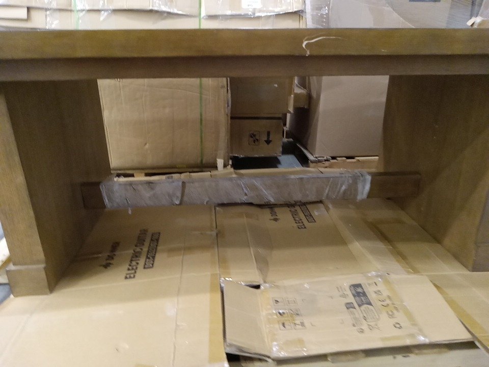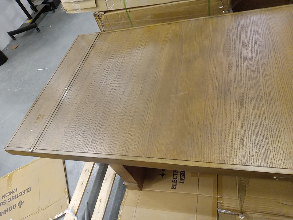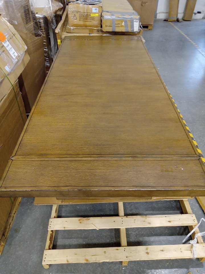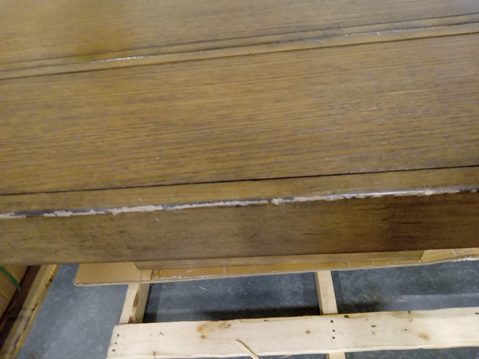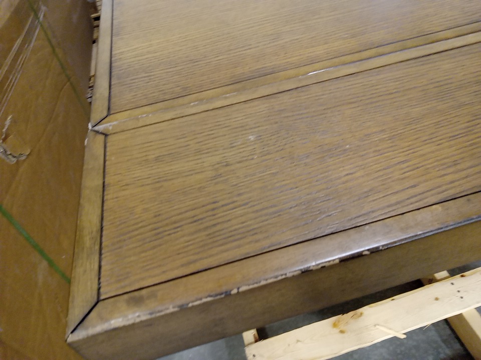 There are multiple scratches and chipping present on the edge of table and chairs from previous use and loose shipping. Lock of one adjustable levelers is broken. Please note this item is big and heavy, bring appropriate vehicle and help at the time of pick up. ~This item retails for 1499$~