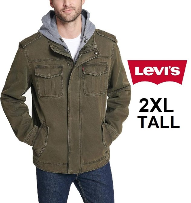 MEN'S LEVI'S WASHED COTTON HOODED MILITARY JACKET - 2XL TALL - khaki beige / grey (style: LM8TC364)
