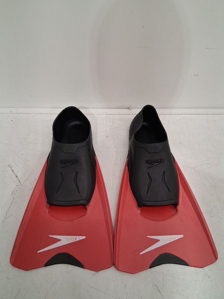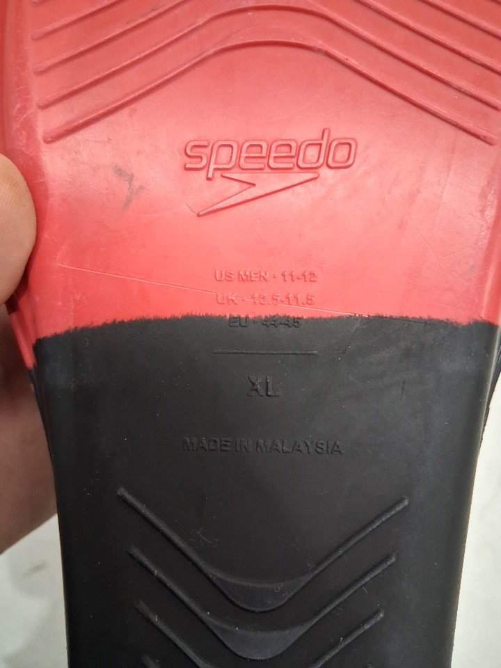Name on the white logo and signs of wear and tear on the bottom of the fins.