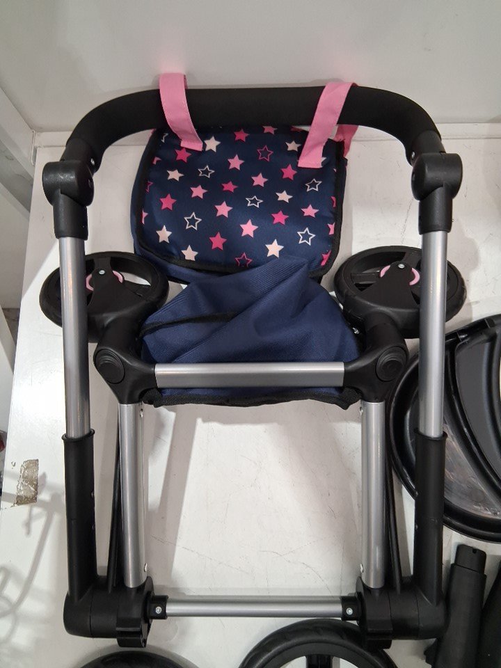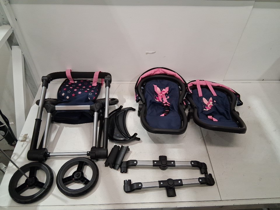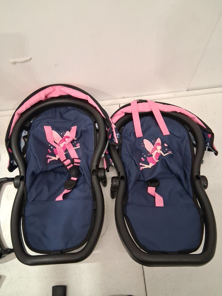 Bayer Design - twin Dolls Pram Xeo - ADJUSTABLE HANDLE Baby Stroller for Dolls with childrens side Bag - navy/pink - (MODEL: 26716aa)