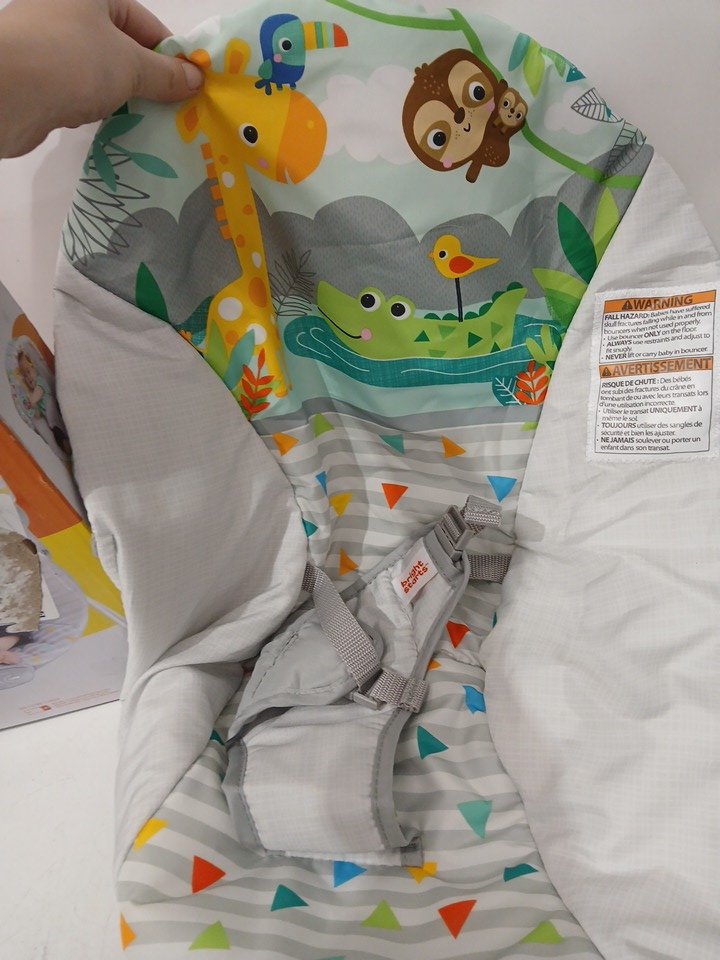 BRIGHT STARTS safari fun PORTABLE 3-POINT HARNESS VIBRATING BOUNCER WITH TOY BAR - Safari/Multicolored (MODEL: 12204)