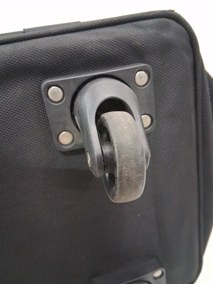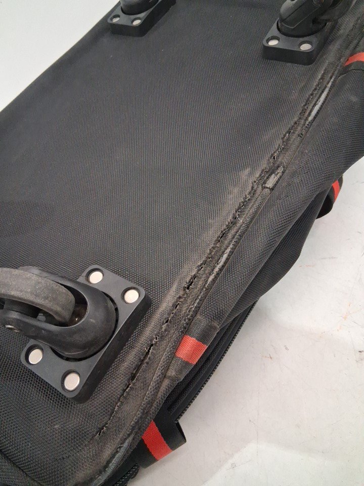 item has been previously used, it looks as though the item was dragged a bit on the edge of the bottom so the fabric there has torn a bit. item is still functional