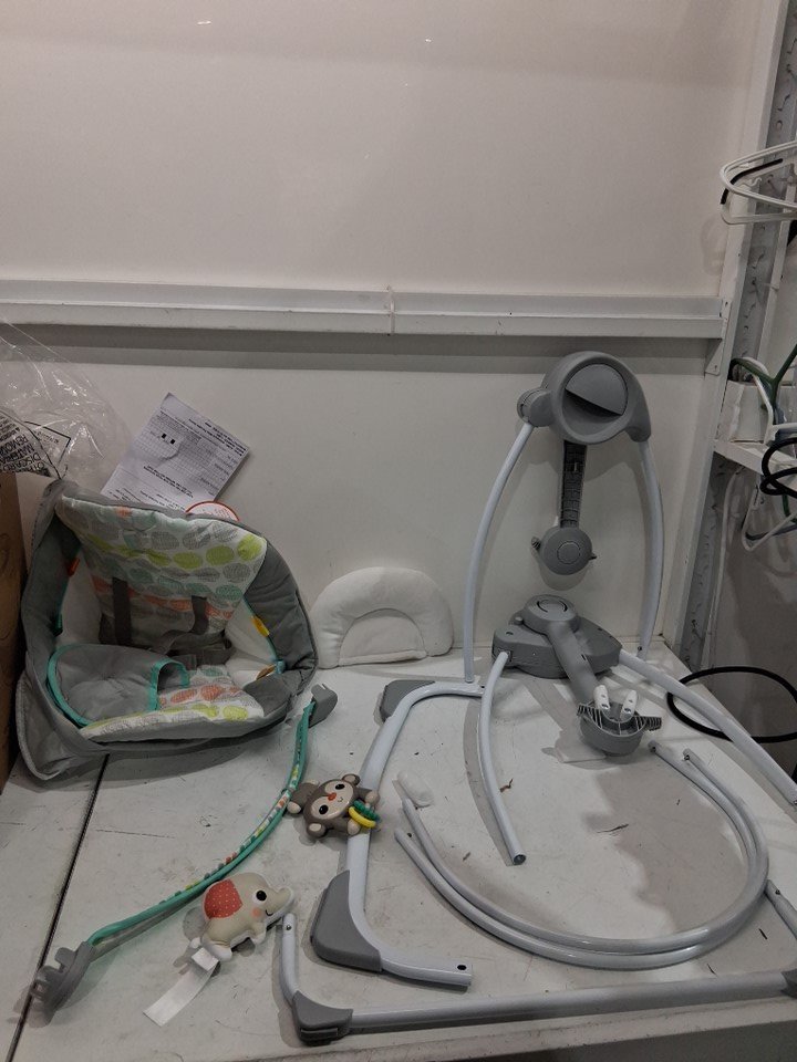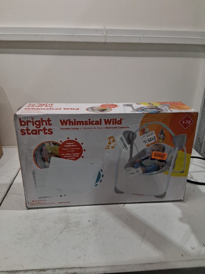 BRIGHT STARTS WHIMSICAL WILD PORTABLE COMPACT AUTOMATIC SWING WITH 10 MELODIES AND ADJUSTABLE HARNESS - MAX 20LBS - WHITE SAFARI ANIMALS (MODEL: 11803-mees)