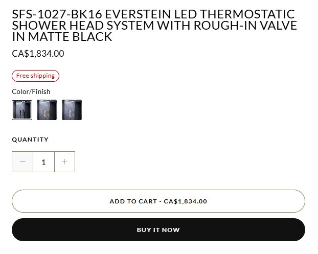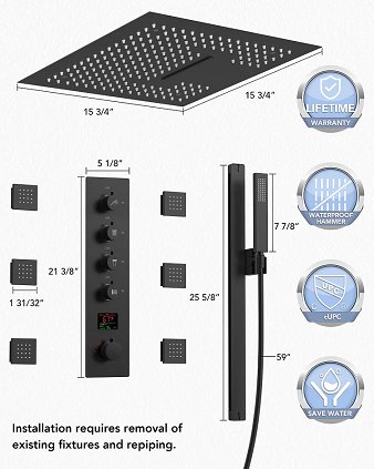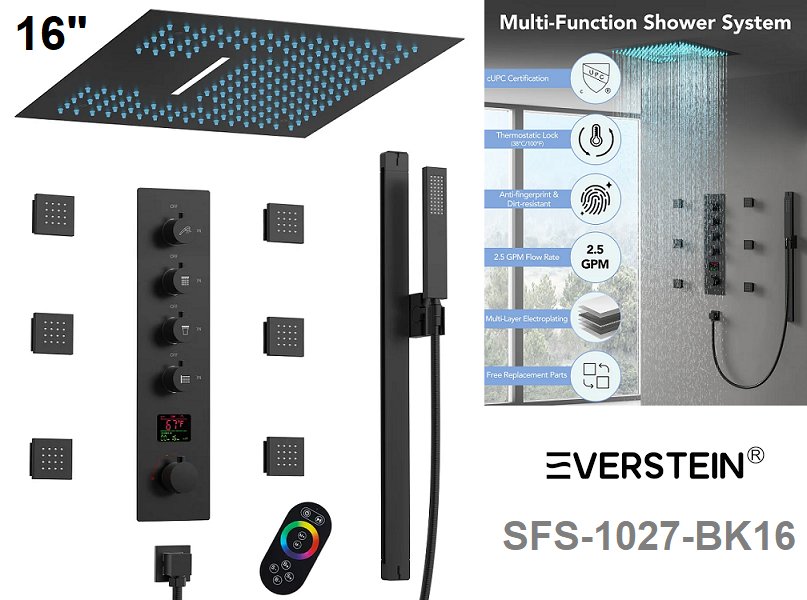 EVERSTEIN LED Thermostatic Shower Head System with Rough-in Valve - 16" Waterfall Shower Head - Matte Black (Model: SFS-1027-BK16)