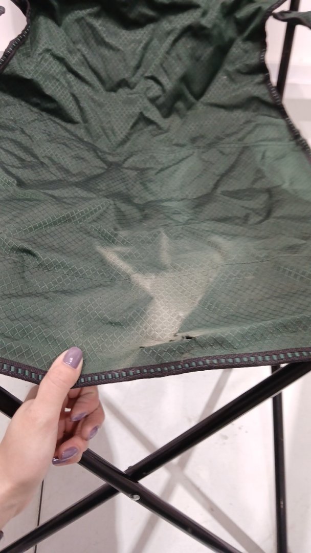 there is a large stain and a few tiny holes in the chair from preivous use, believed to be from camp fire
