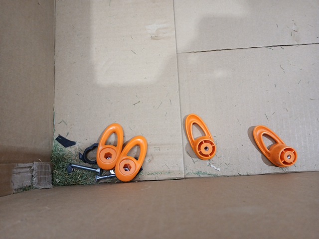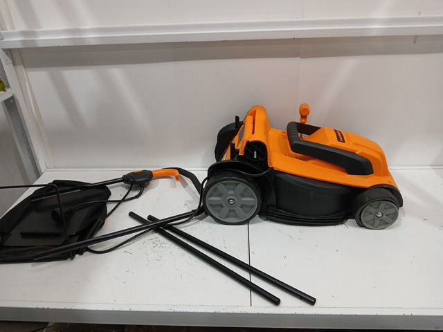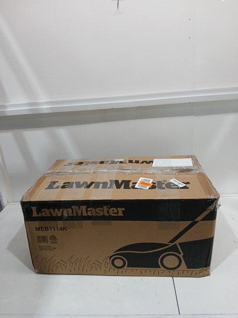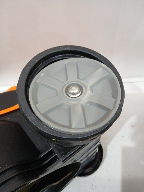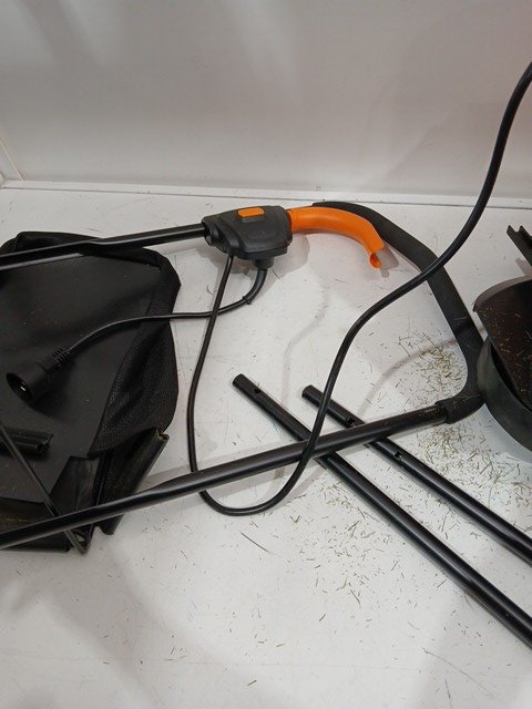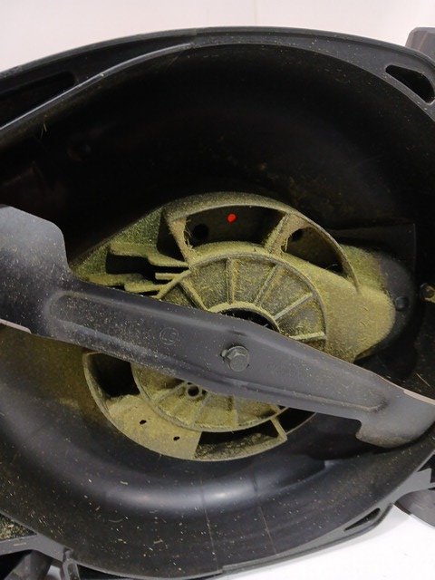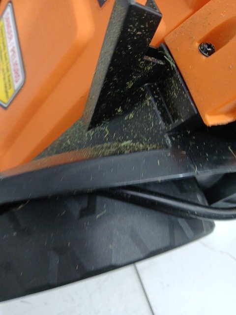 There is a lot of grass clippings, one of the wheels are damaged, and there is loose plastic and hardware in the box. Cannot test for power.