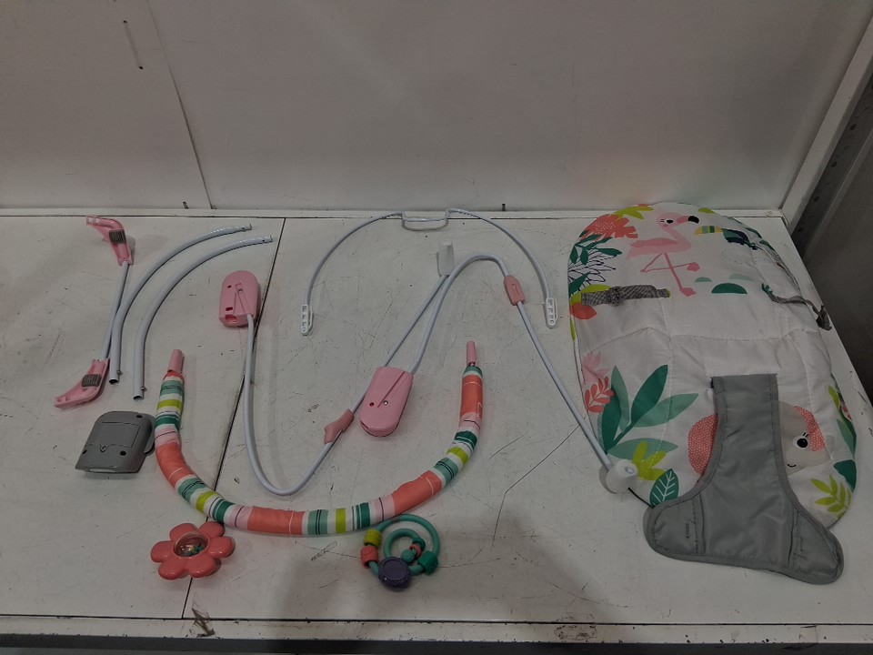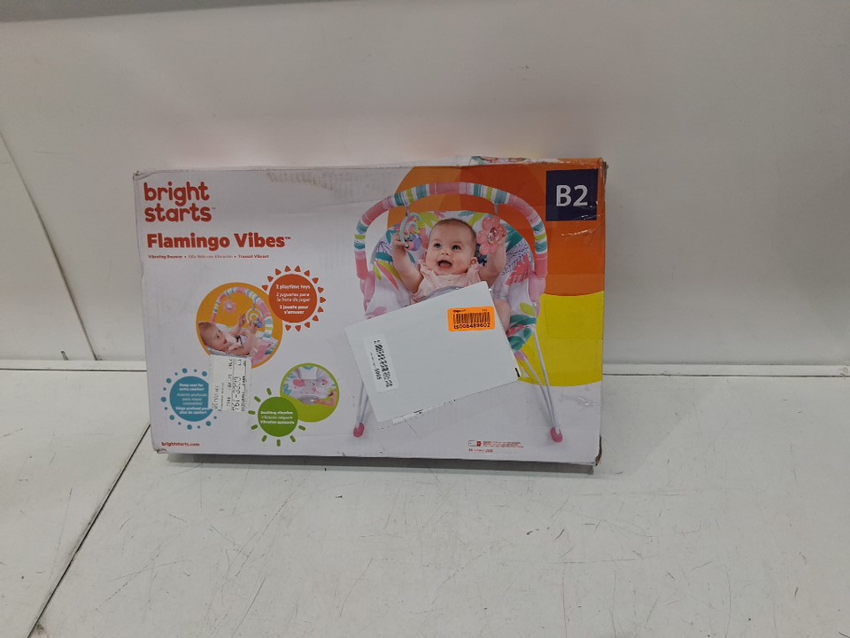 BRIGHT STARTS 3-POINT HARNESS HARNESS VIBRATING BABY BOUNCER WITH-TOY BAR - FLAMINGO VIBES - multicolour (MODEL: 12228)
