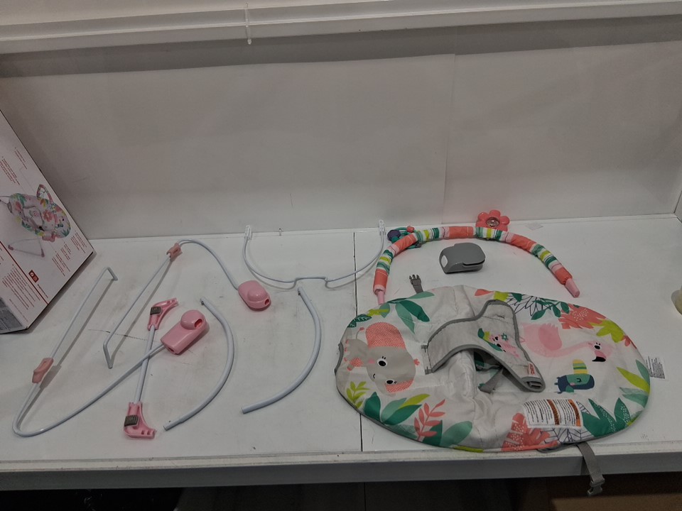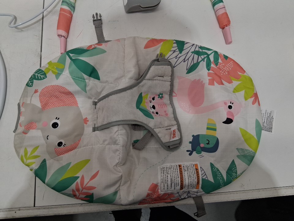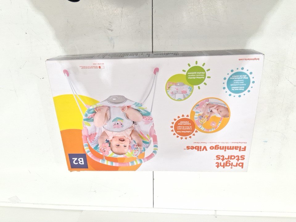 BRIGHT STARTS 3-POINT HARNESS HARNESS VIBRATING BABY BOUNCER WITH-TOY BAR - FLAMINGO VIBES - multicolour (MODEL: 12228)