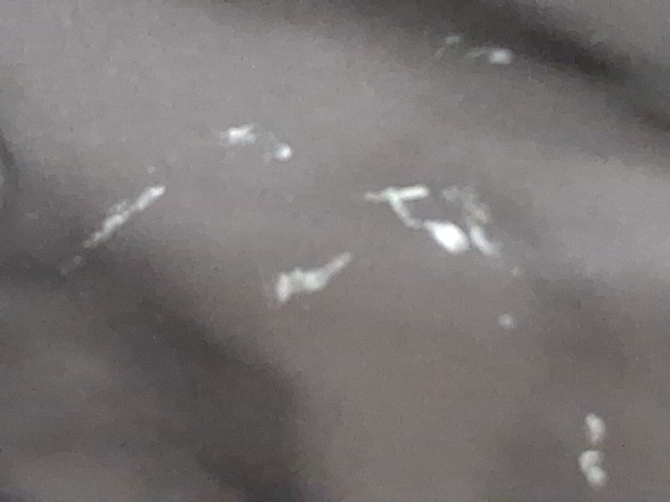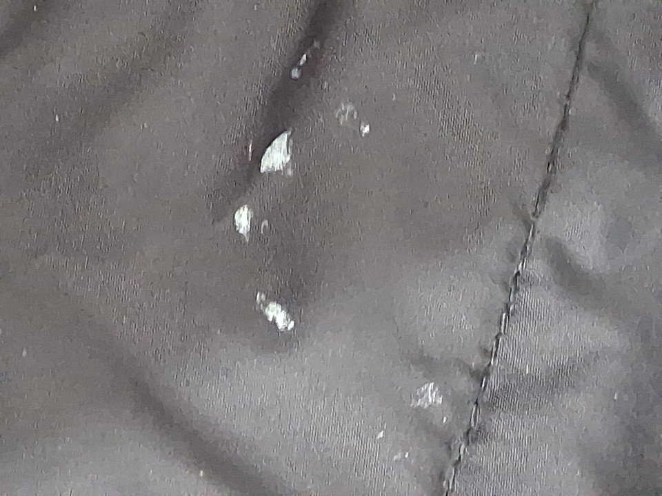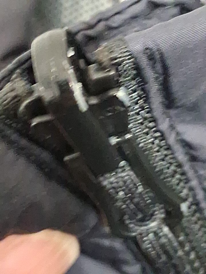 there is 2 small paint like spots near the right pocket and the right arm, as well as chipping on the zipper.